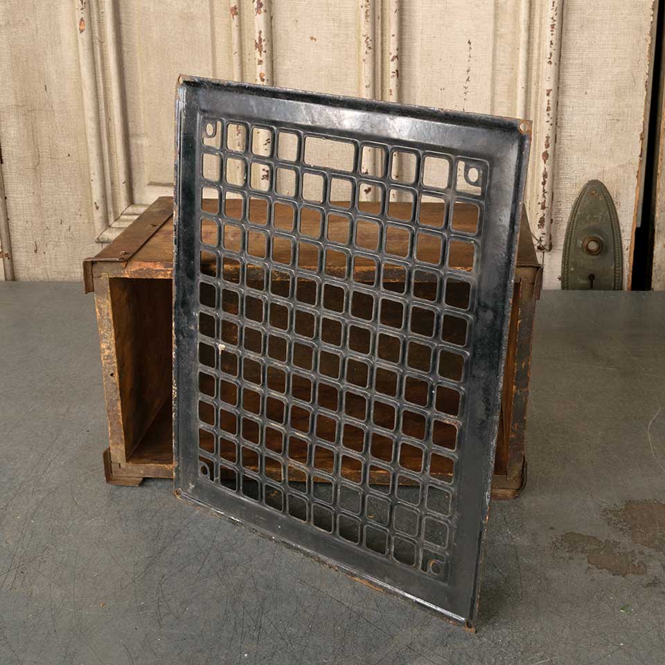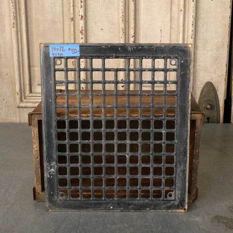 Architectural salvage antique stamped metal heat grate floor vent cover measuring approx. 10" x 12" (insert dimensions) and 12" x 14" (overall dimensions). There are no louvers with this heat grate. See photos to evaluate condition.
