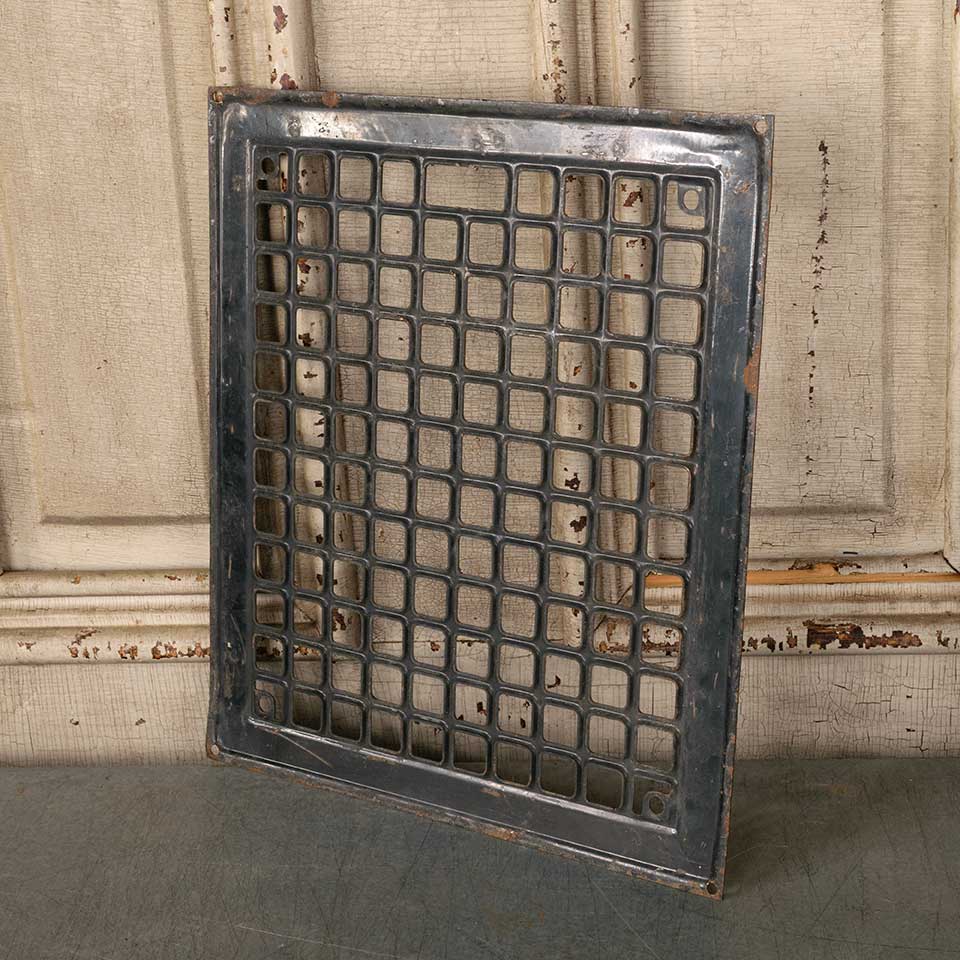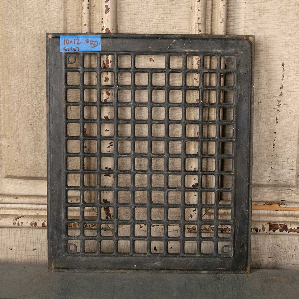 Architectural salvage antique stamped metal heat grate floor vent cover measuring approx. 10" x 12" (insert dimensions) and 12" x 14" (overall dimensions). There are no louvers with this heat grate. See photos to evaluate condition.
