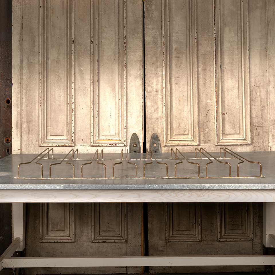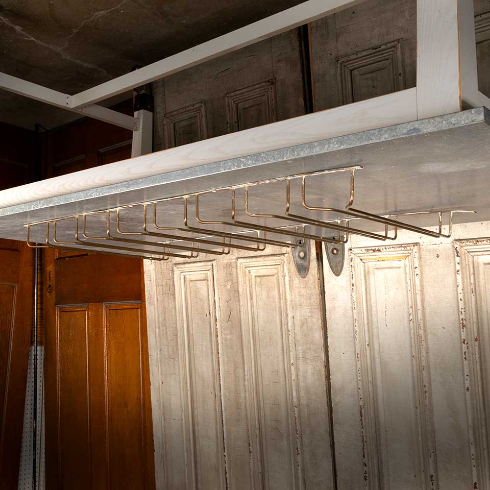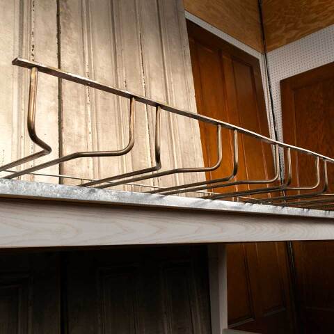 Architectural salvage brass wine glass holder rack measuring approx. 48" wide x 3" tall x 21 1/2" front to back. Color and condition vary. Priced at $45/each.