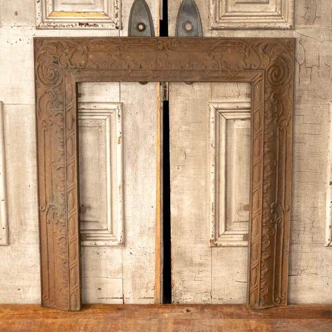 Architectural salvage antique ornate cast iron fireplace surround measuring approx. 30" wide x 32 1/2" tall x 2 1/4" front to back. The interior firebox opening measures approx. 20" wide x 27 1/4" tall. See photos to evaluate condition.