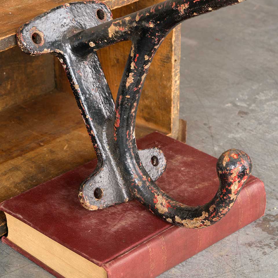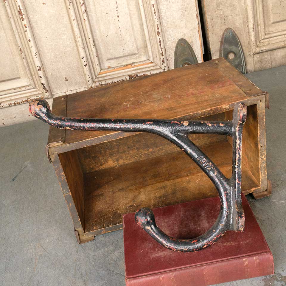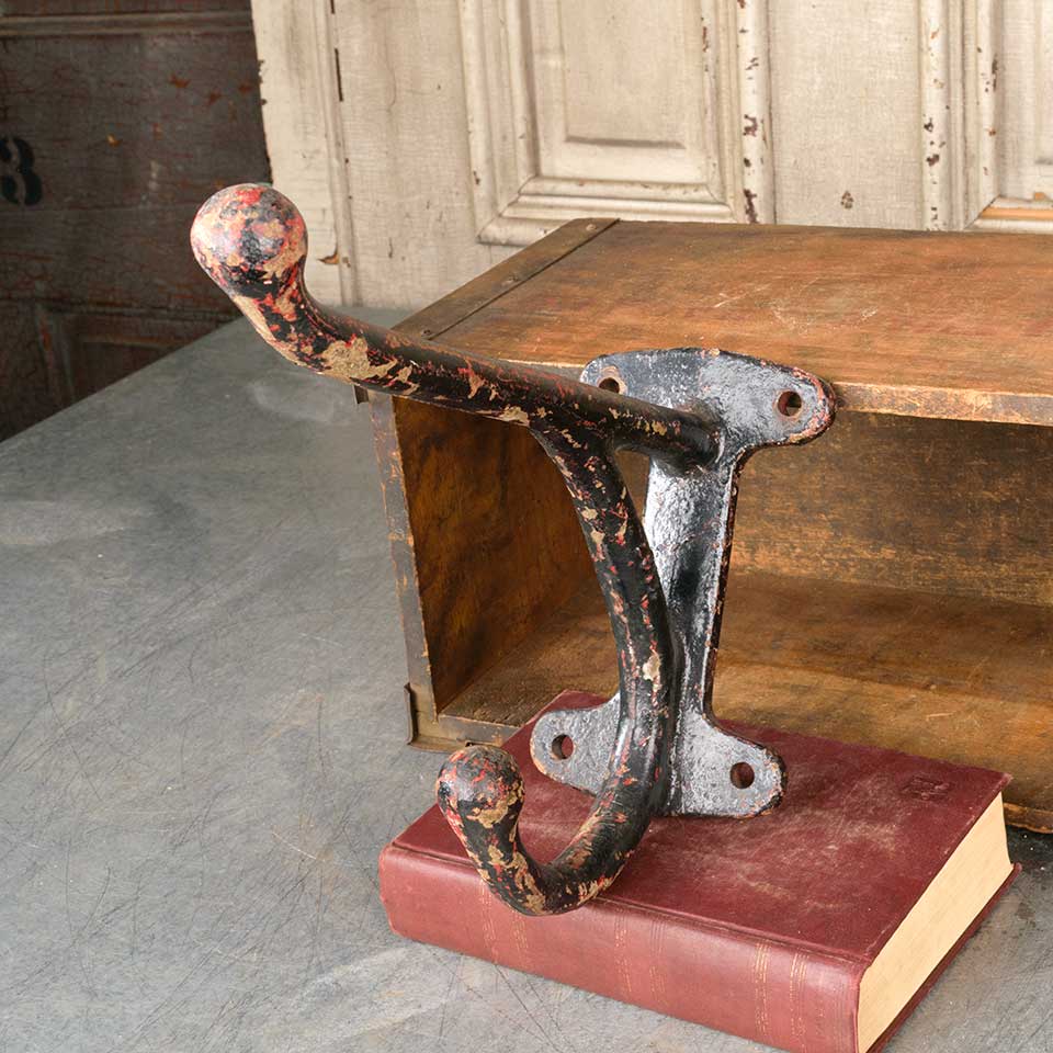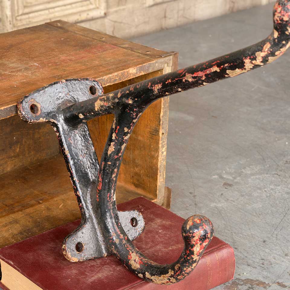 Architectural salvage antique large cast iron wall mount hook measuring approx. 4 1/2" wide x 7 1/2" tall with a 13" front to back. Color and condition vary.