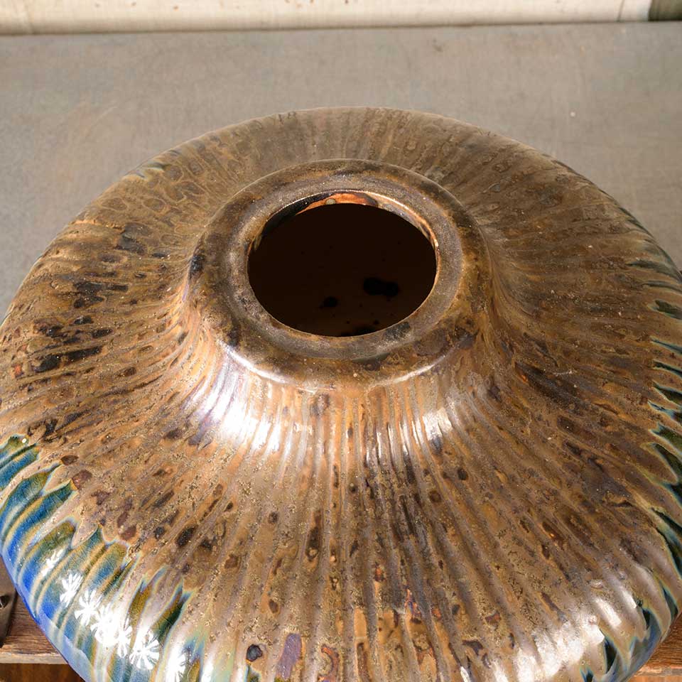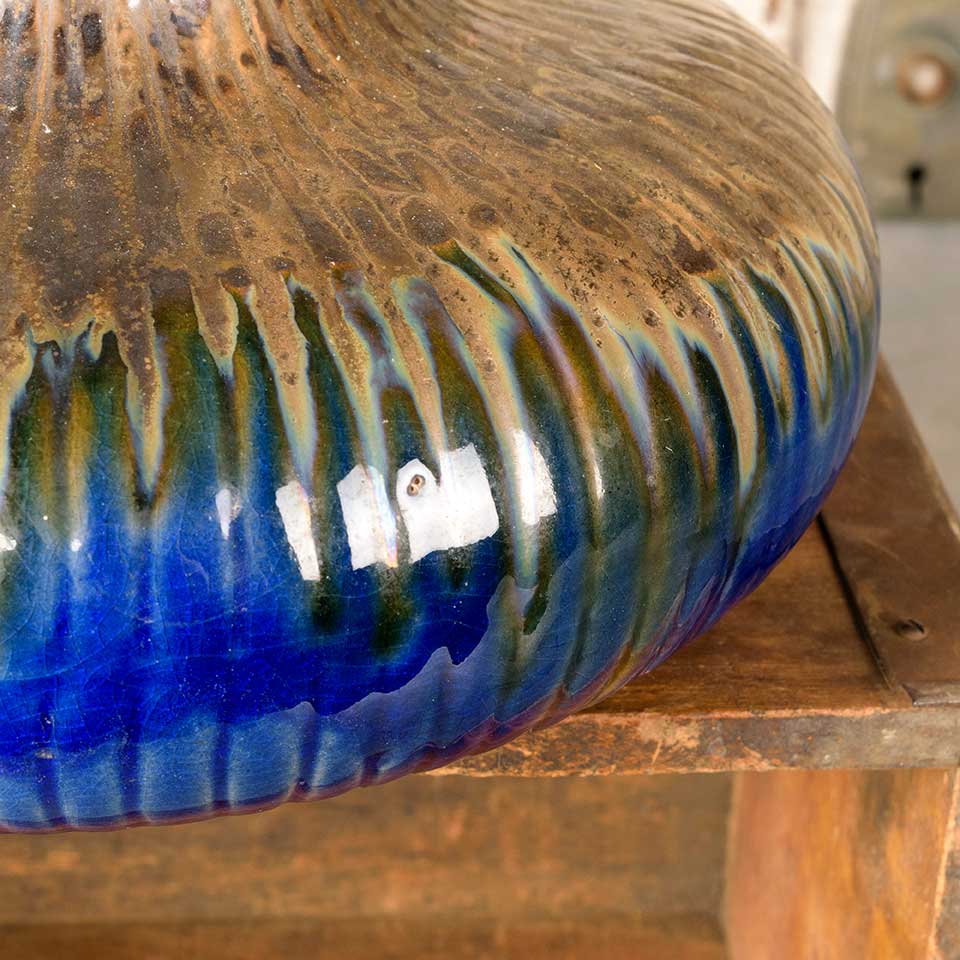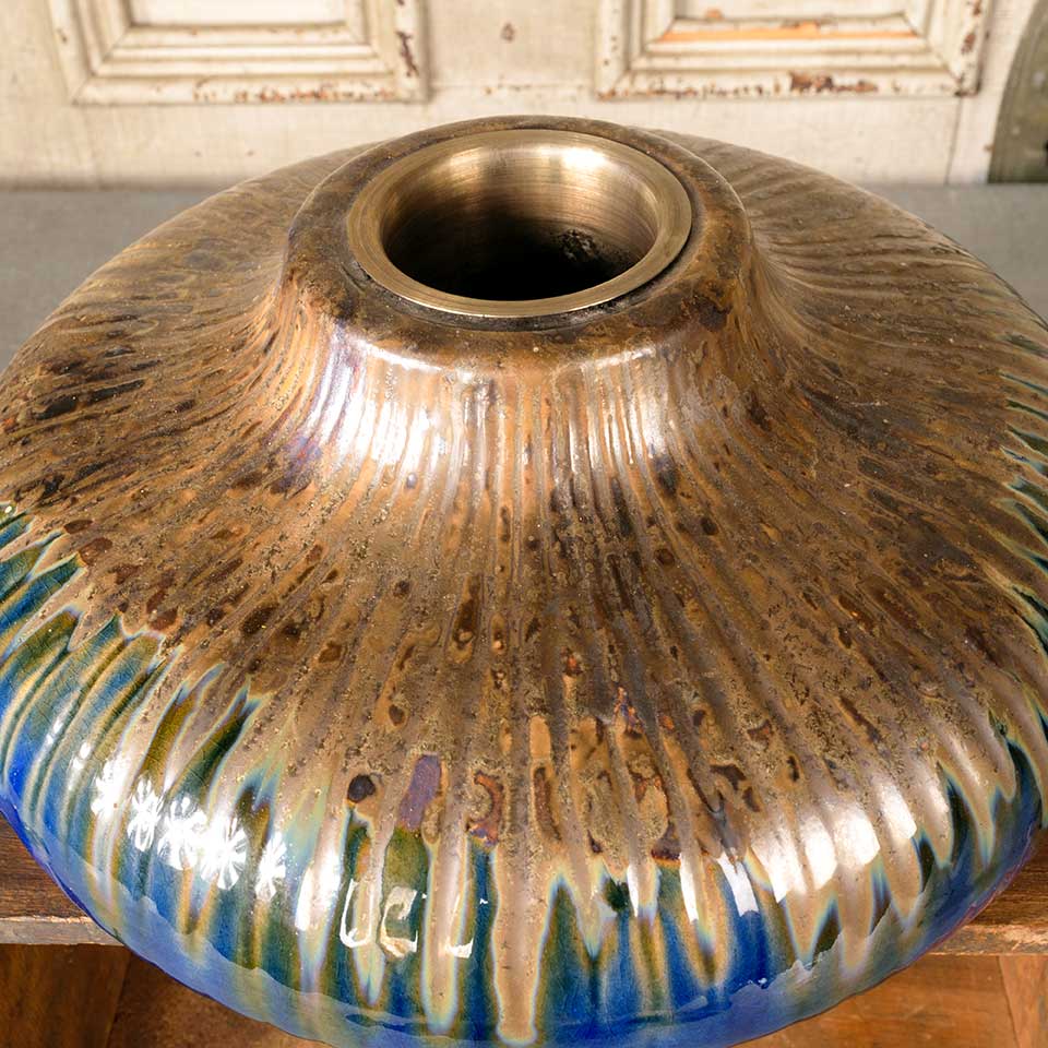 Salvaged ceramic patio table top fire feature decor piece measuring approx. 11 1/2" diameter x 6" tall with a removable metal insert with a 3" diameter opening. See photos to evaluate condition.