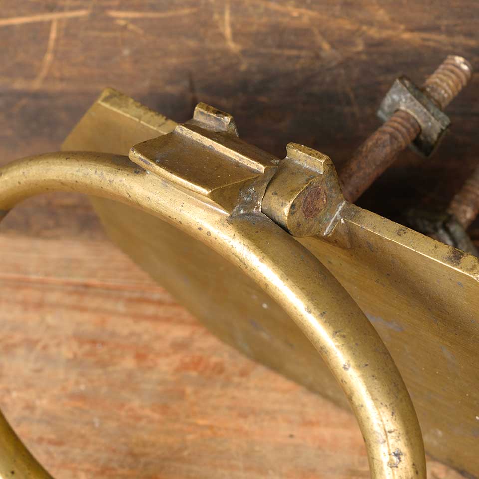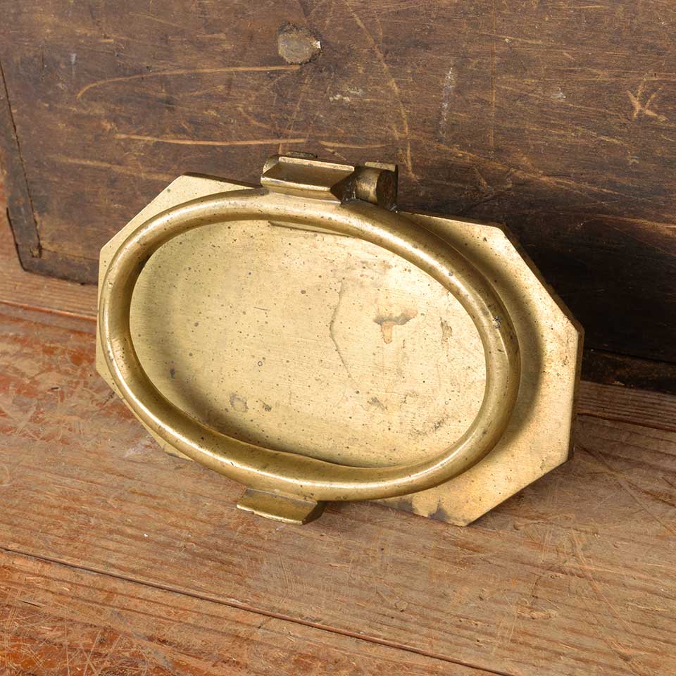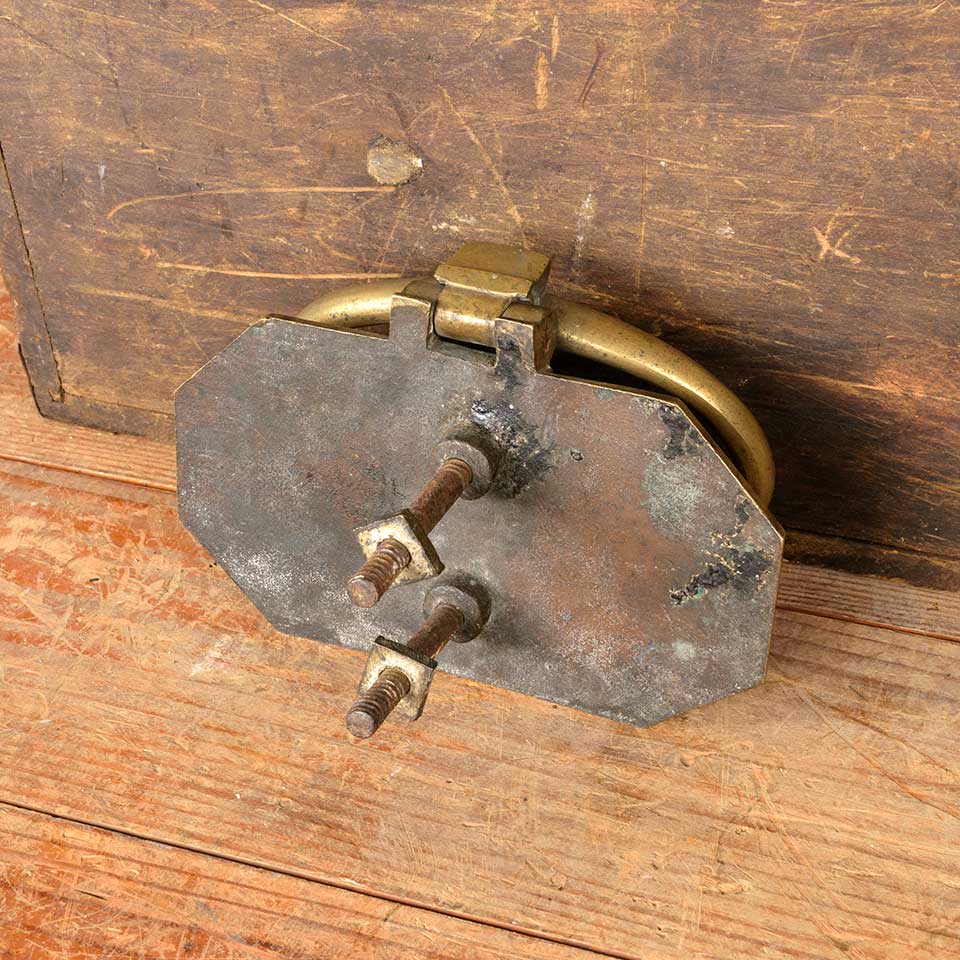 Architectural salvage antique large brass hand door knocker door hardware measuring approx. 6 3/4" wide x 4 1/4" tall x 1 5/8" front to back. See photos to evaluate condition.