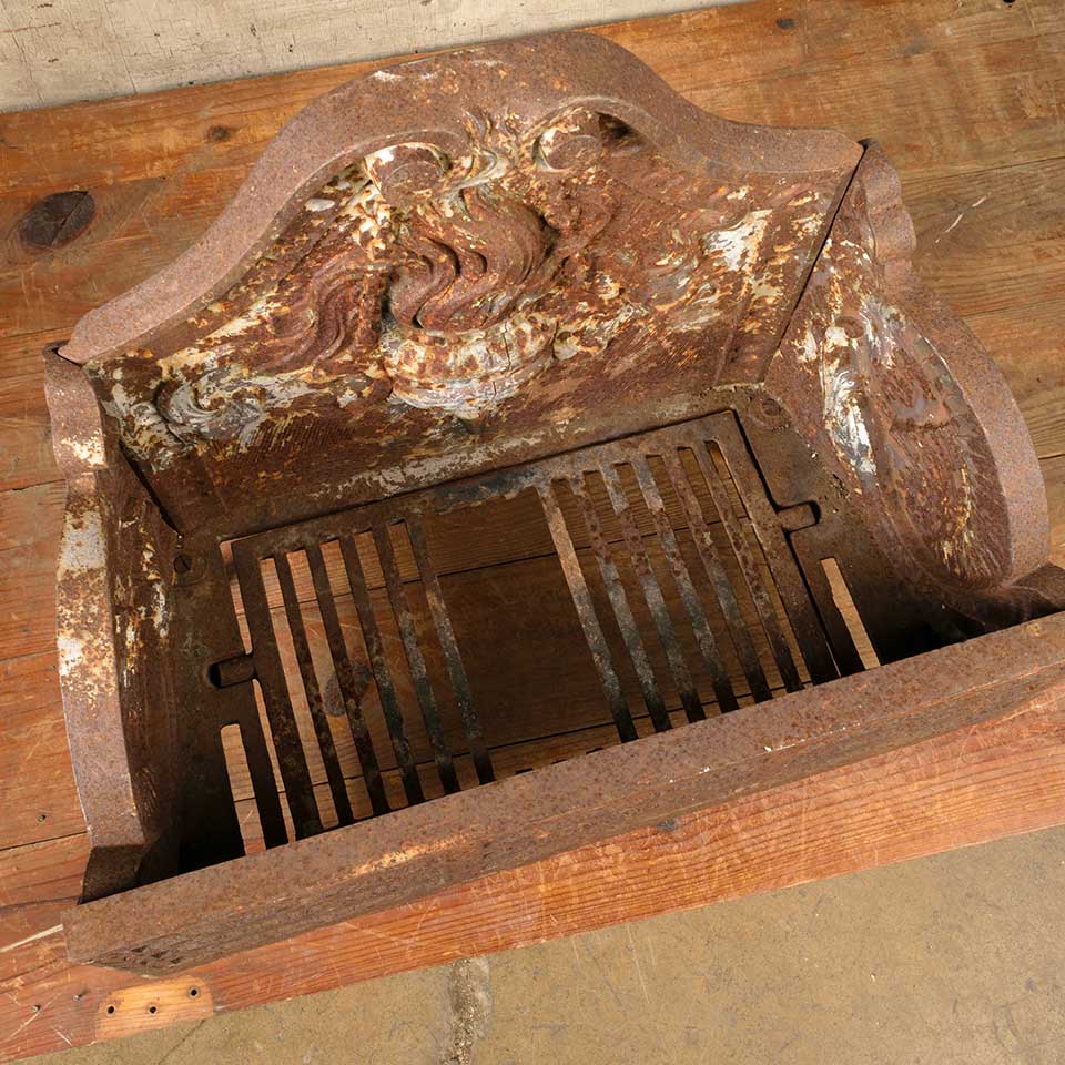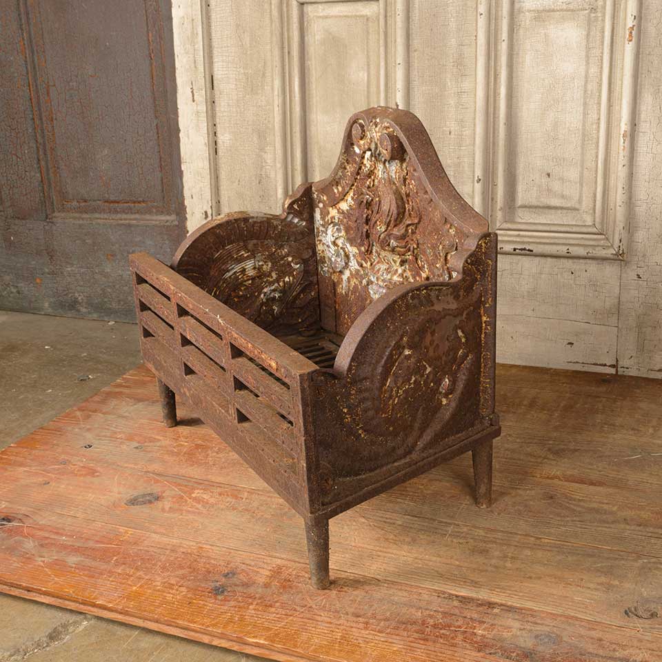 Architectural salvage antique cast iron fireplace log holder with flame and dragon motif measuring approx. 21 1/2" wide x 18" tall x 11" front to back. There's a crack in the back of the piece and three of the grate bars are missing. See photos to evaluate condition.