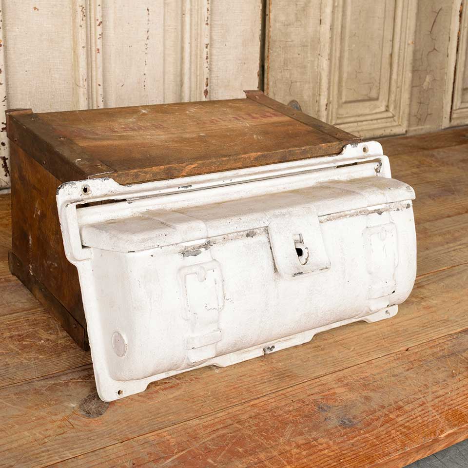 Architectural salvage antique Remington Hardware Company painted cast aluminum mailbox with buckle motif measuring approx. 16 1/2" wide x 8 1/2" tall x 4" front to back. See photos to evaluate condition.