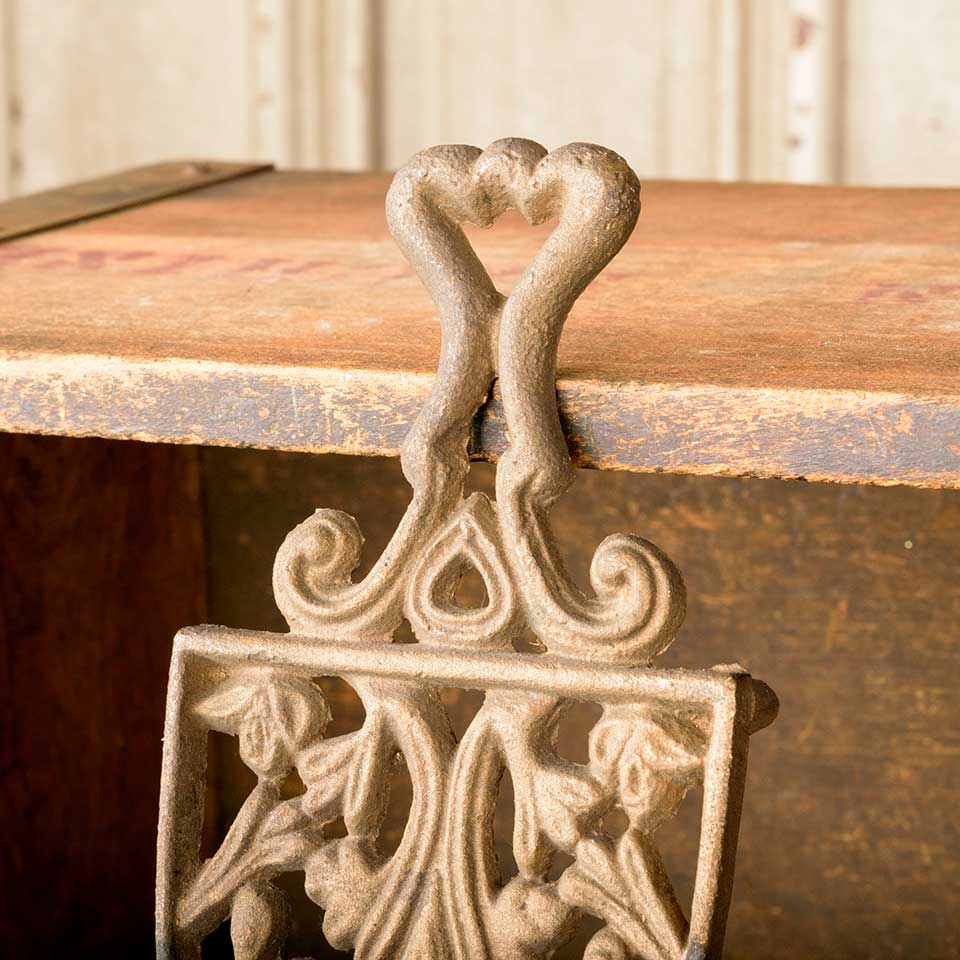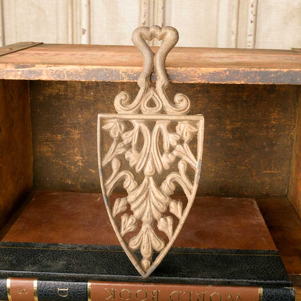 Antique cast brass sad iron trivet measuring approx. 3 3/8" wide x 7/8" tall x 8" long. See photos to evaluate condition.