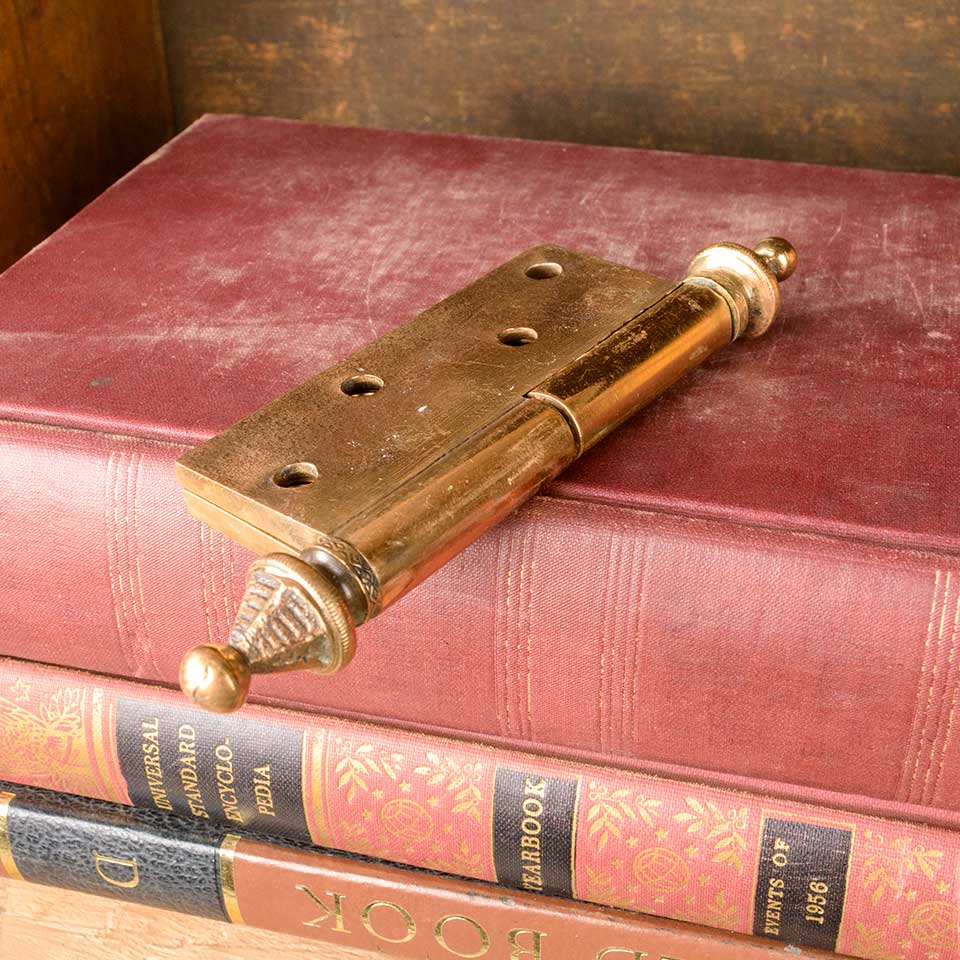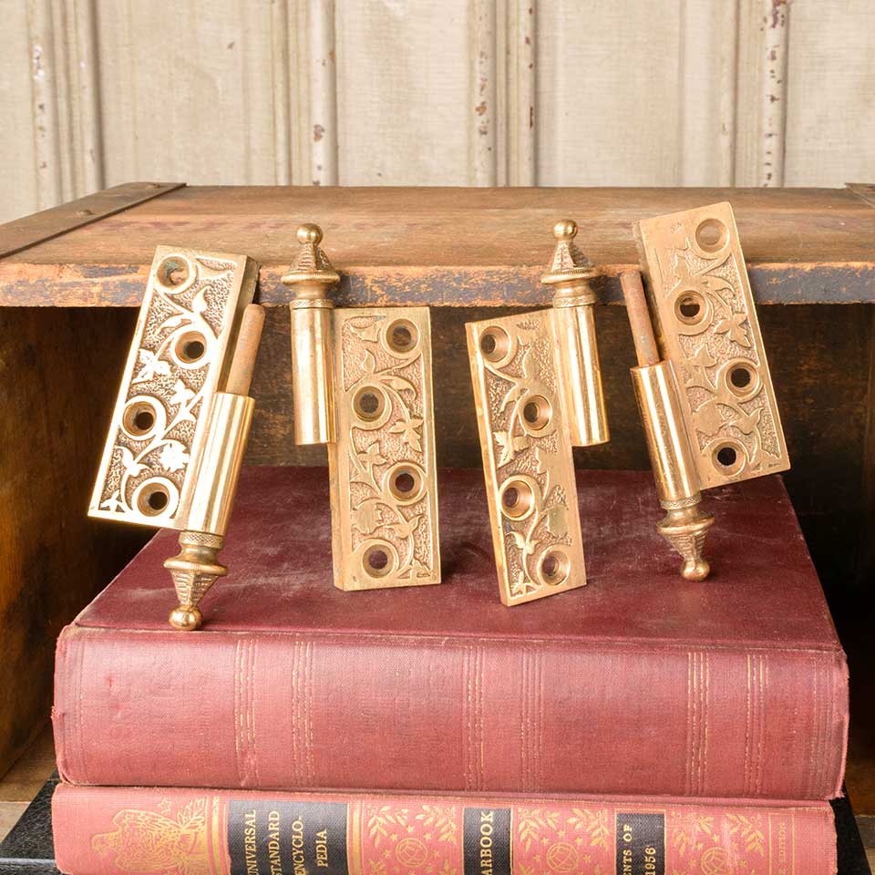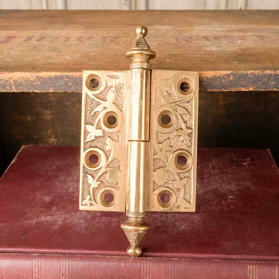 Architectural salvage antique ornate solid bronze lift off door butt hinge hardware with steeple finials measuring approx. 2 3/4" wide x 3 1/4" tall (5 1/4" including finials) x 3/16" thick. Two left hand and two right hand hinges available. Color and condition may vary.