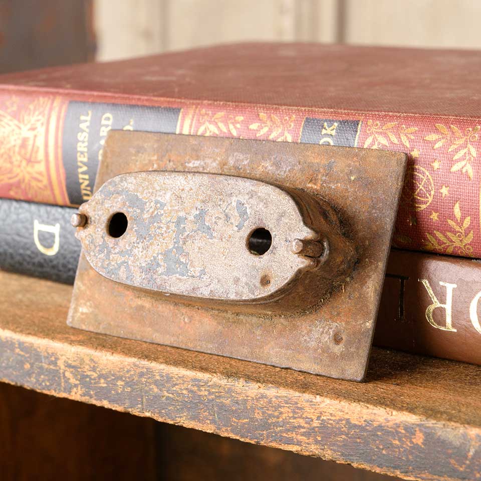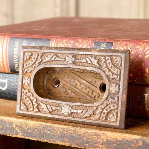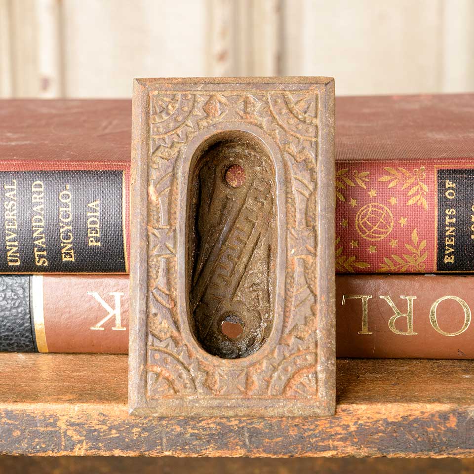 Architectural salvage antique Victorian cast iron window sash lift hardware with Eastlake patterns measuring approx. 3" wide x 1 3/4" tall x 5/8" front to back. The recessed area measures approx. 2 1/8" wide x 7/8" tall. Color and condition may vary.