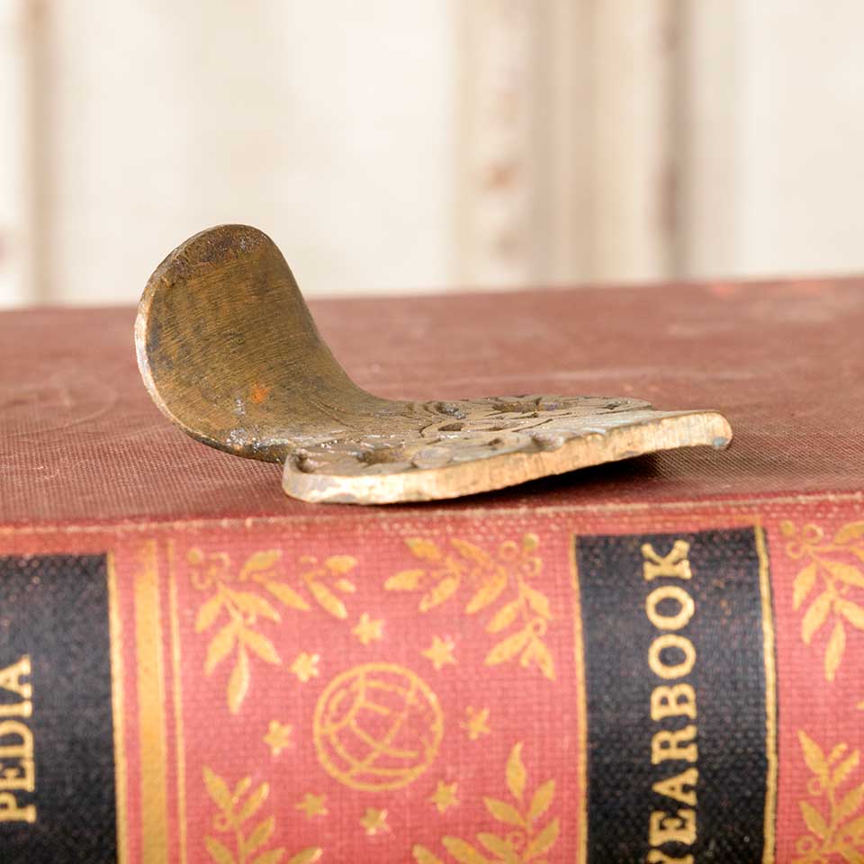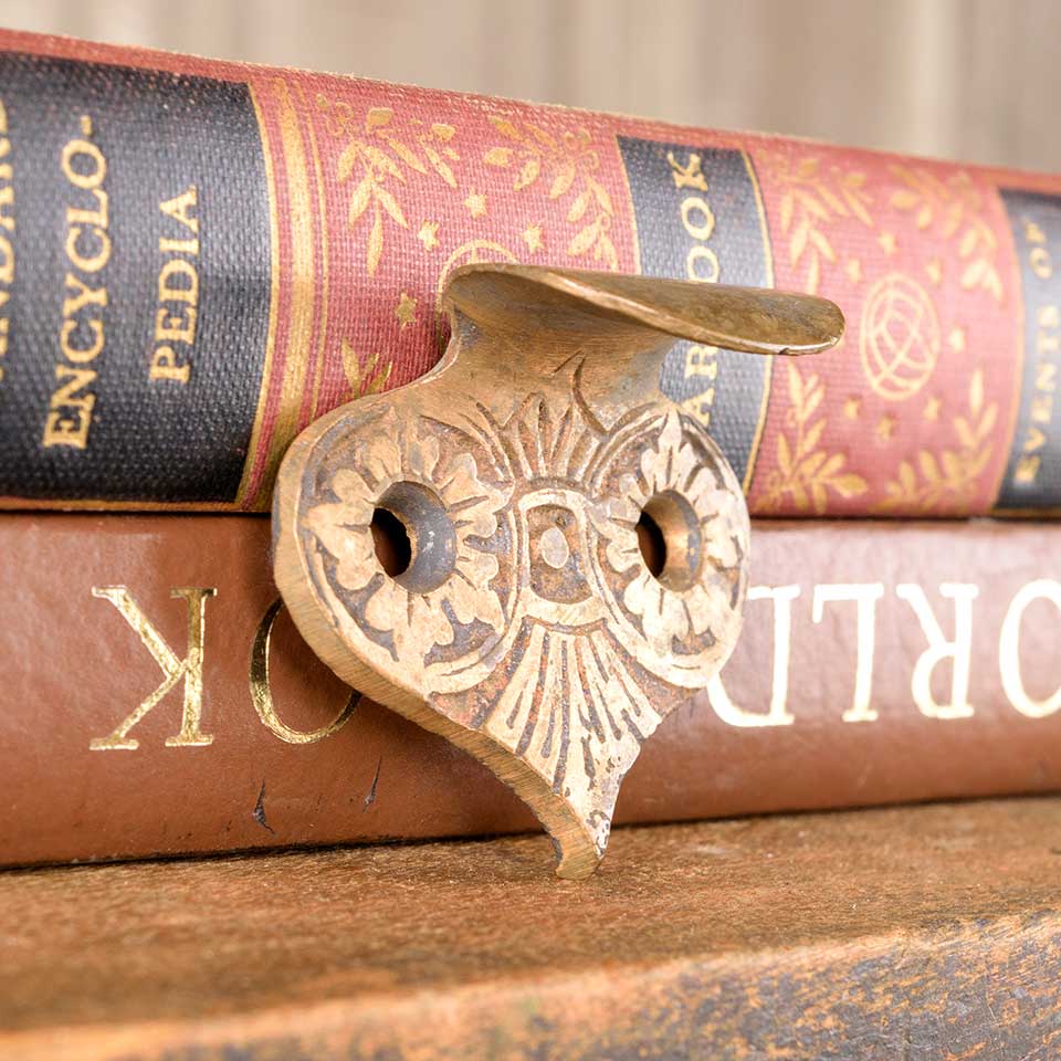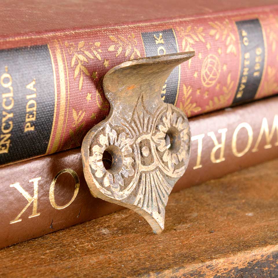 Architectural salvage antique ornate solid bronze window sash finger lift hardware measuring approx. 1 3/4" wide x 1 1/2" tall x 1" front to back. Color and condition may vary.