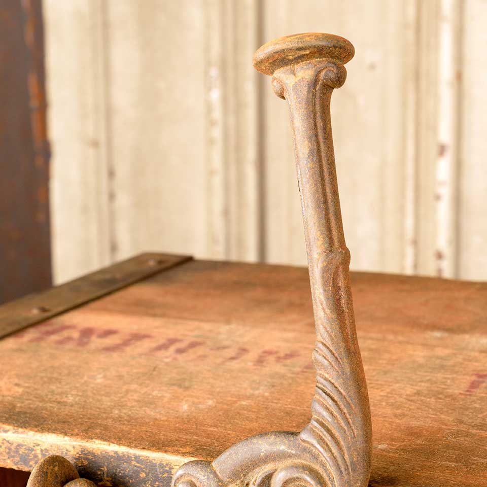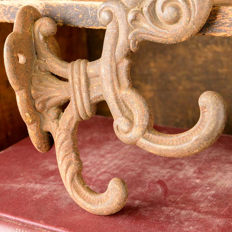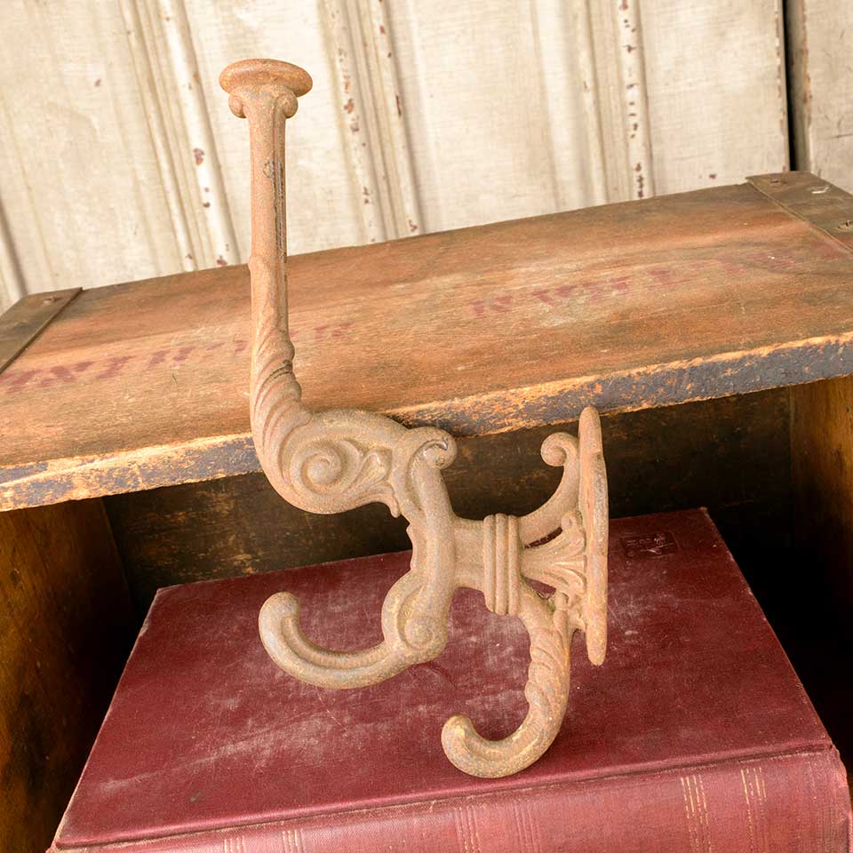 Architectural salvage large ornate antique cast iron hat and coat hook measuring approx. 1 3/4" wide x 7 3/4" tall x 4 " front to back. Color and condition may vary.