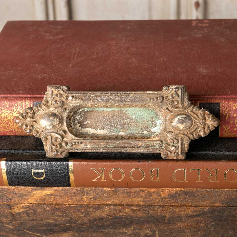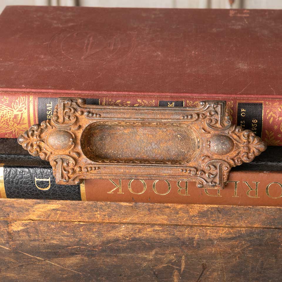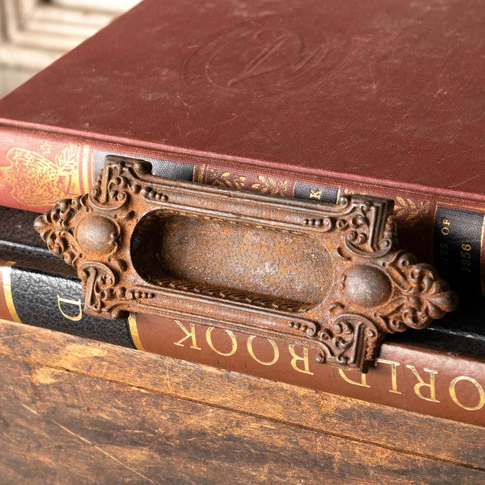 Architectural salvage antique ornate cast iron window sash lift hardware c. early 1900's measuring approx. 5" wide x 1 3/4" tall x 5/8" front to back. Recessed area measures 2 3/8" wide x 7/8" tall. Color and condition may vary.