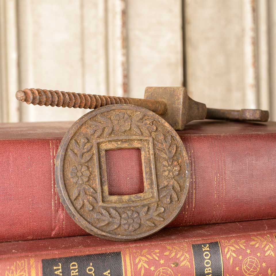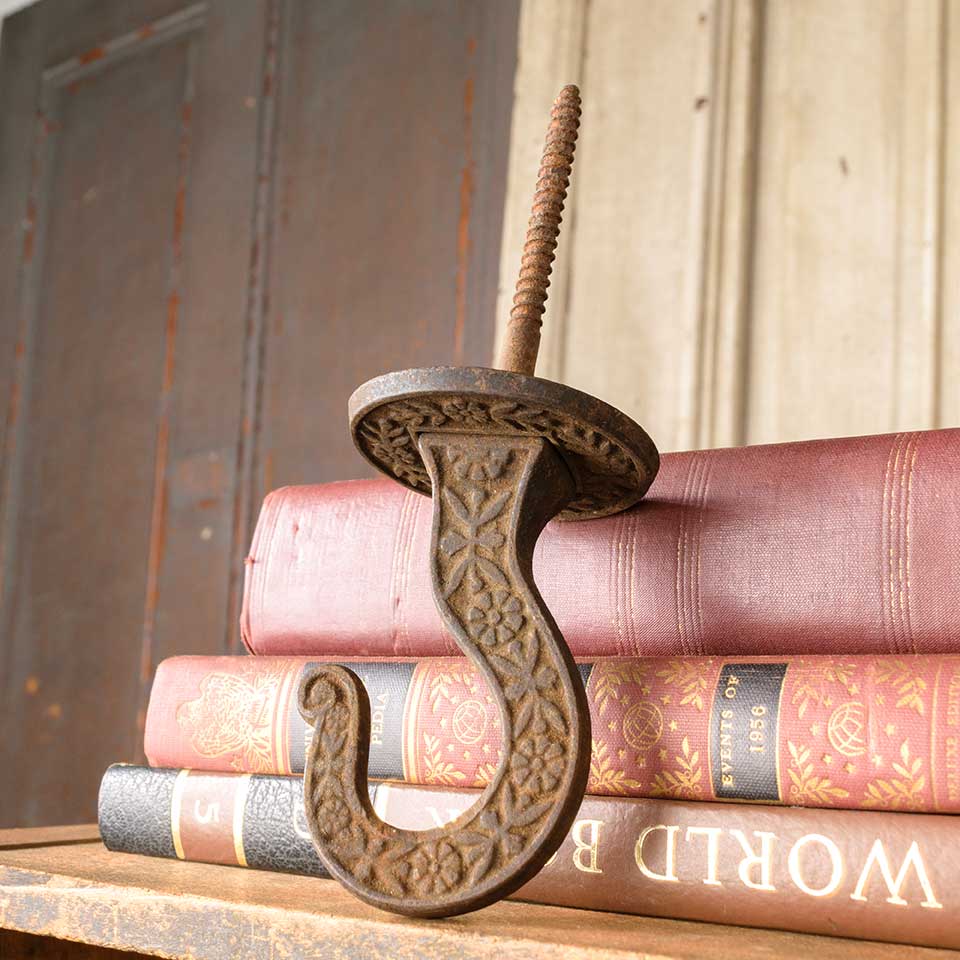 Architectural salvage antique cast iron Victorian Eastlake patterned chandelier ceiling hook with integral wood screw and removable backplate measuring approx. 2 1/2" wide x 7 1/4" tall (hook itself is 3 5/8" tall). See photos to evaluate condition.