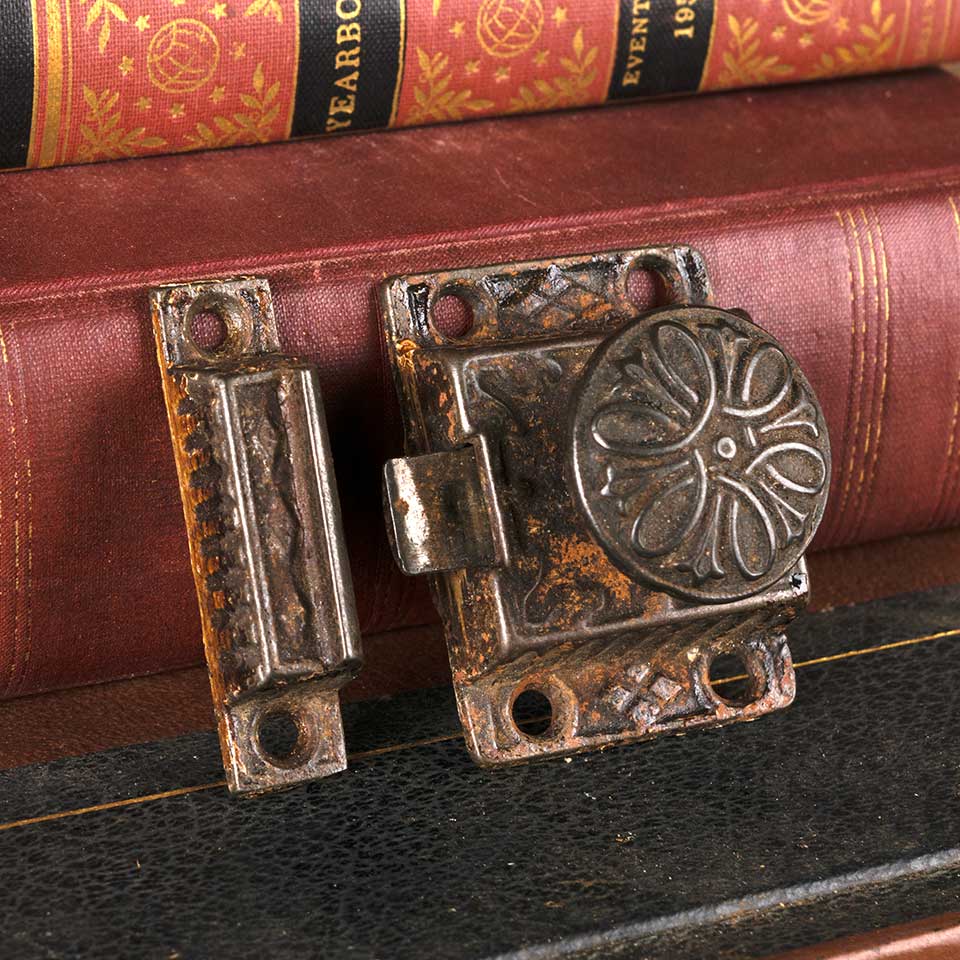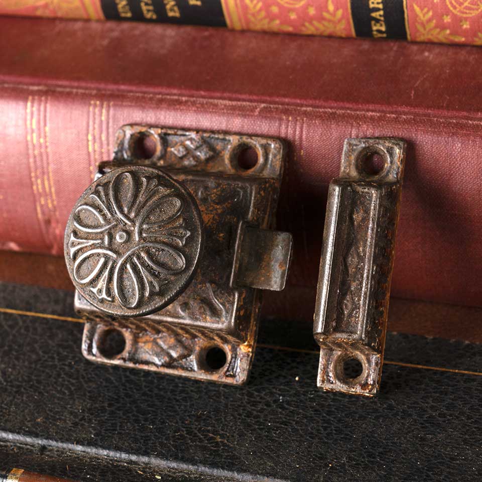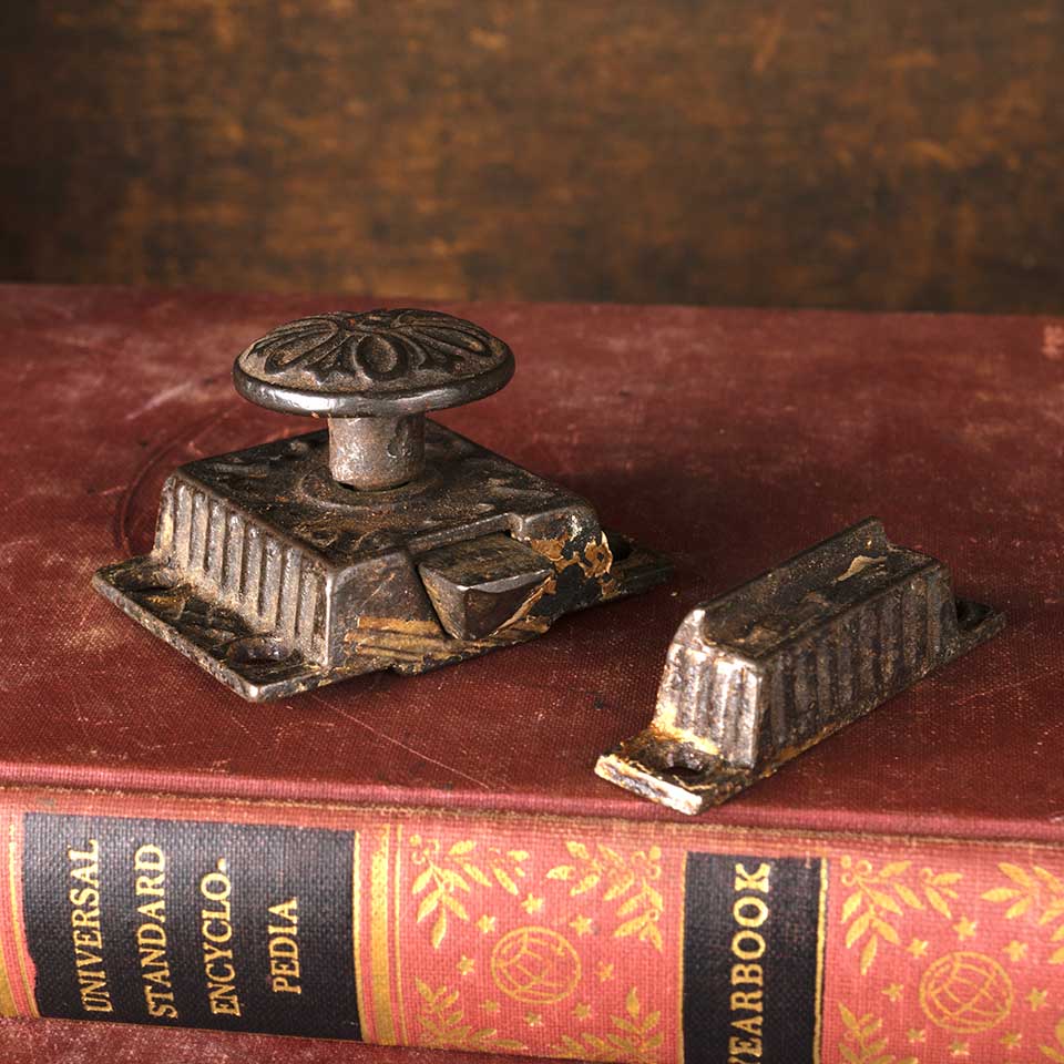 Architectural salvage antique ornate Victorian spring loaded cast iron & brass kitchen cabinet latch. The latch measures approx. 1 5/8" wide x 2 1/8" tall x 1 1/4" front to back and the catch measures approx. 1/2" wide x 2 1/4" tall x 3/4" front to back. Color and condition vary.
