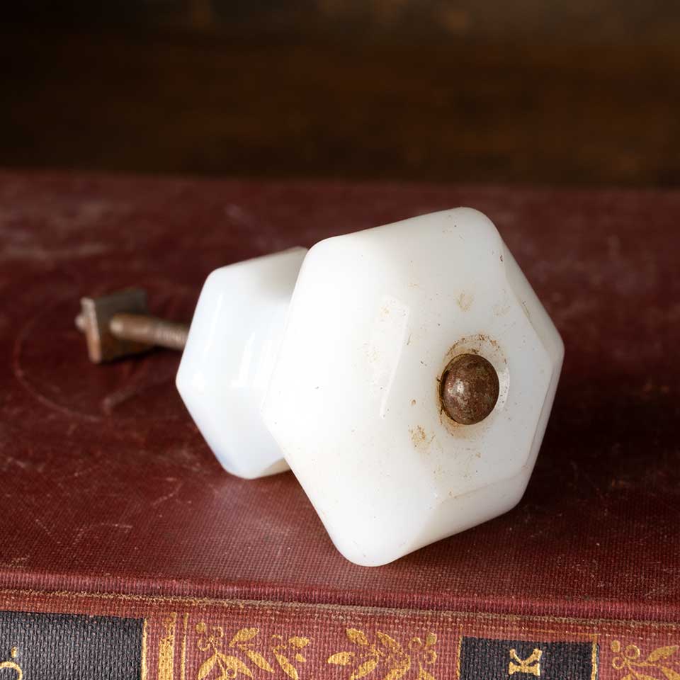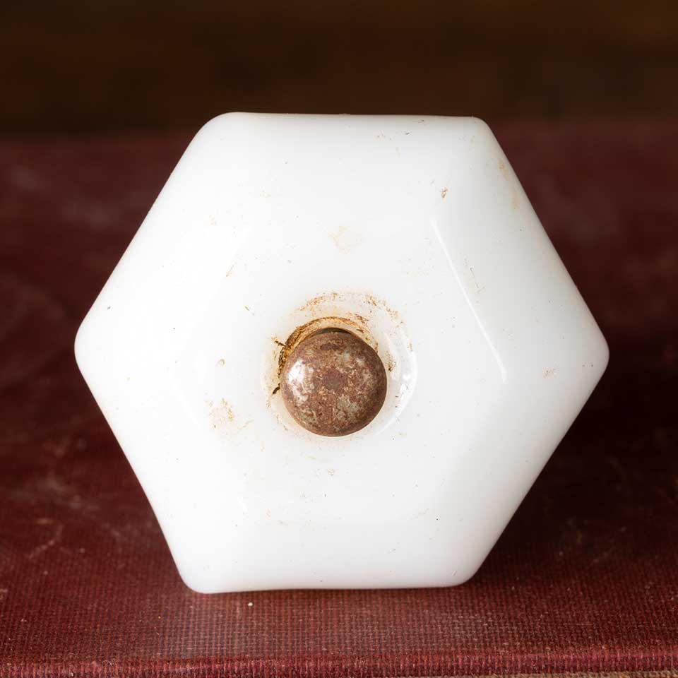Architectural salvage antique hexagonal pressed milk glass furniture drawer / cabinet knob hardware measuring approx. 1 1/2" in diameter x 1 1/2" front to back and the base measuring 1" in diameter. Color and condition may vary.