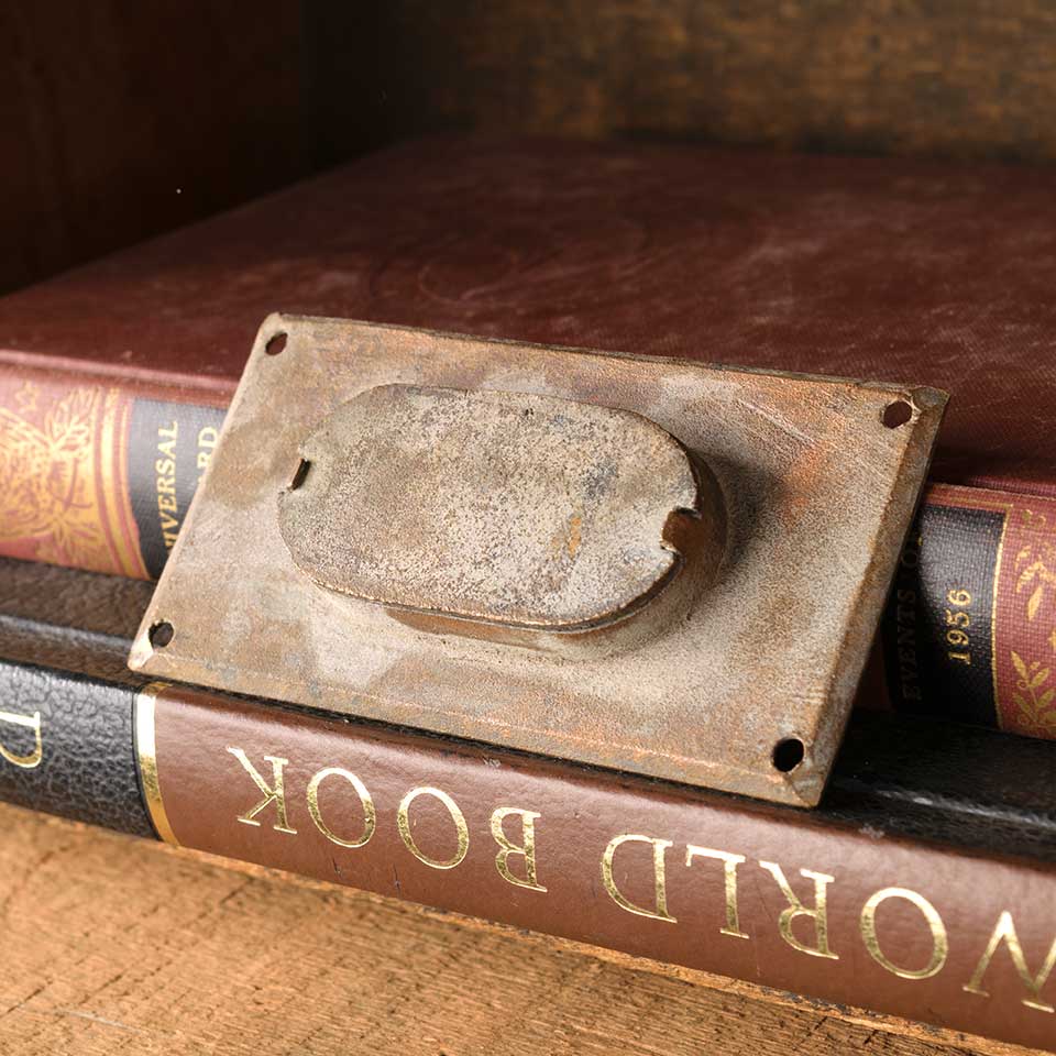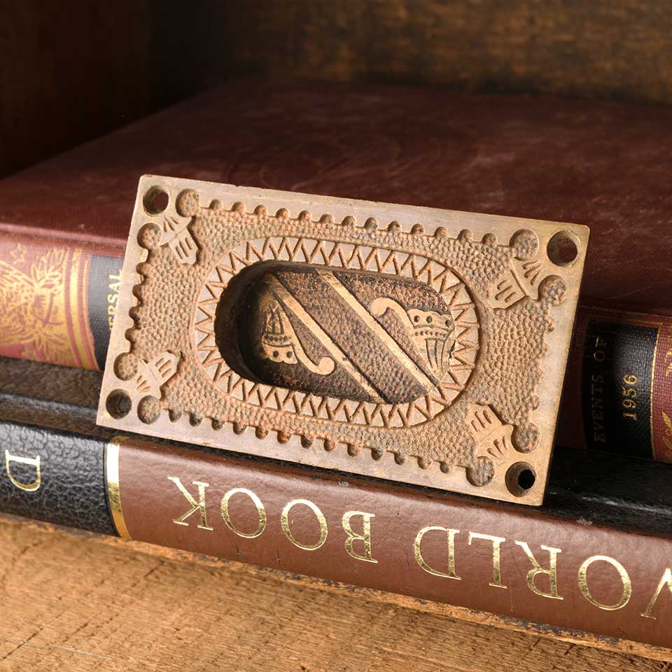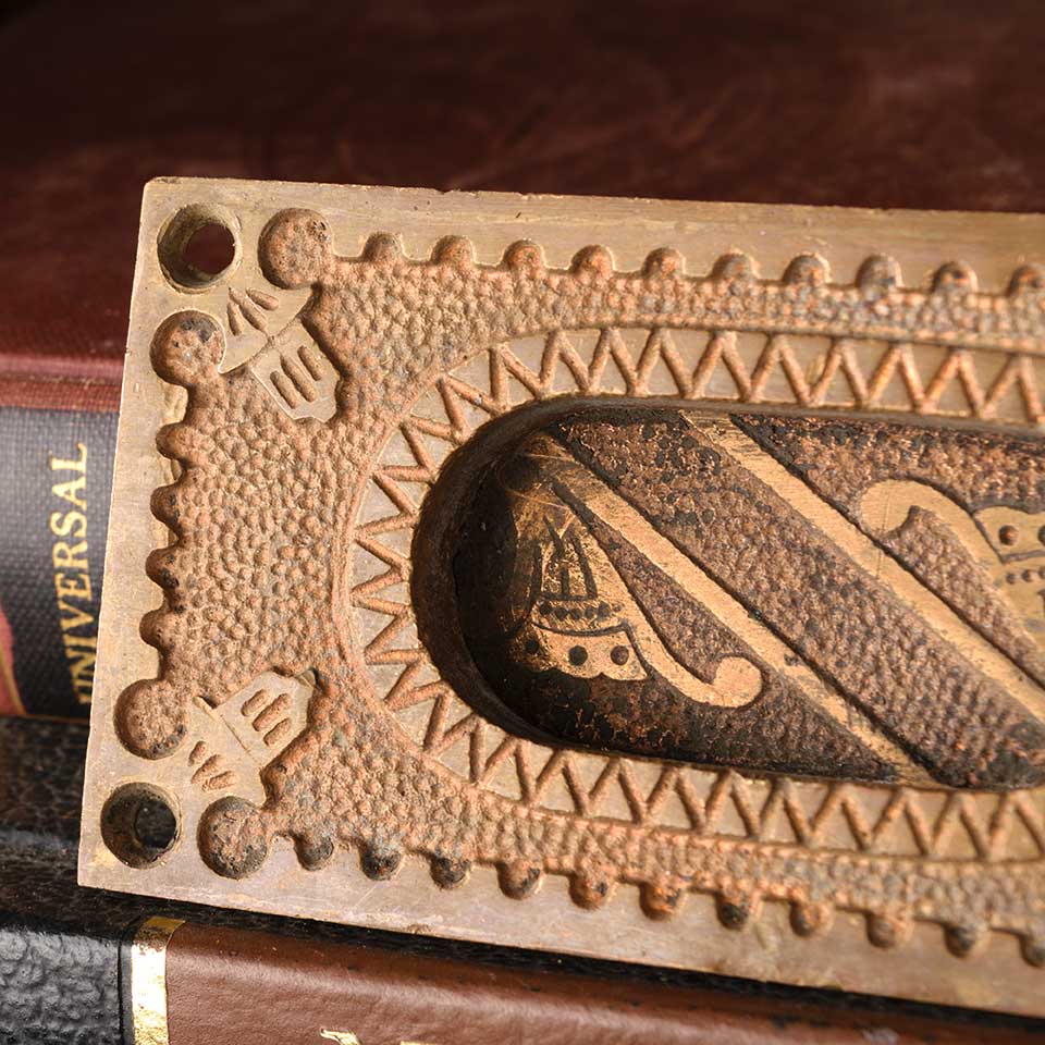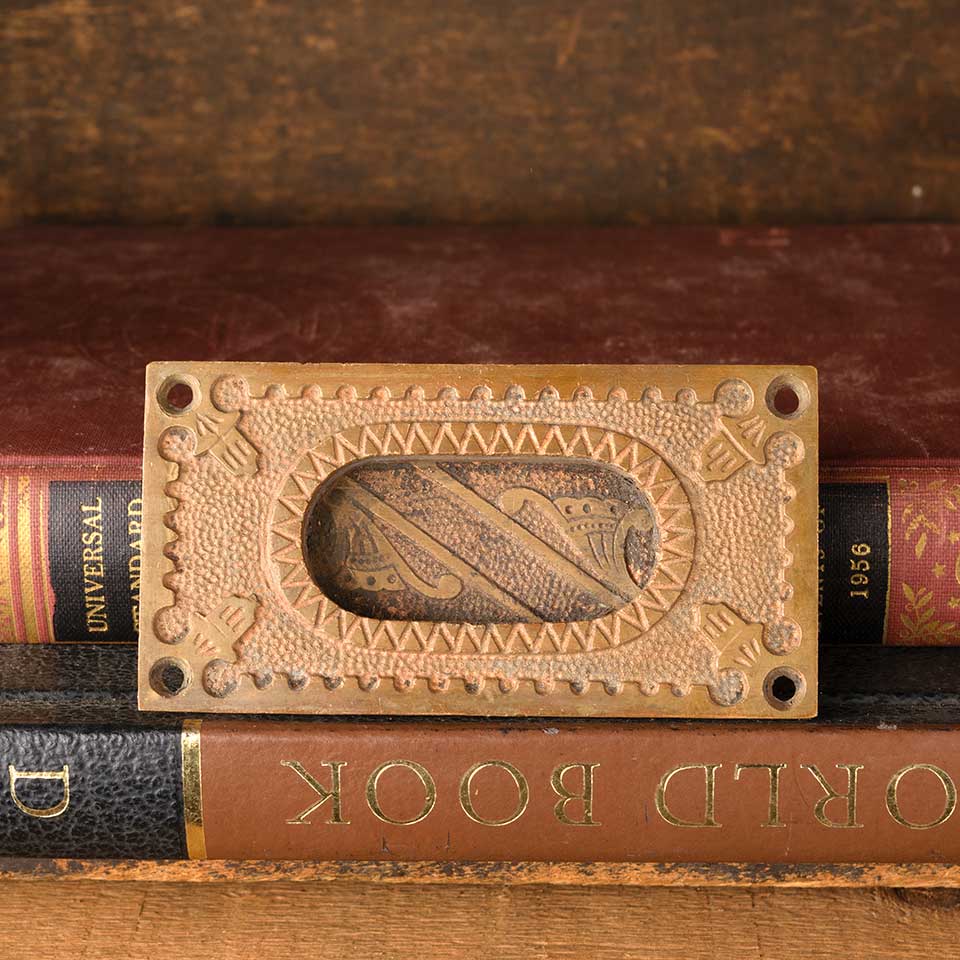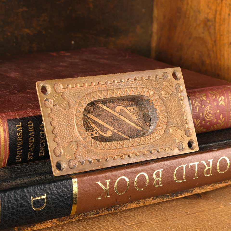 Architectural salvage antique bronze ornate Victorian window sash finger lift hardware measuring approx. 3 3/4" wide x 2" tall x 1/2" front to back. The recessed area measures 2 1/8" x 1". See photos to evaluate condition.