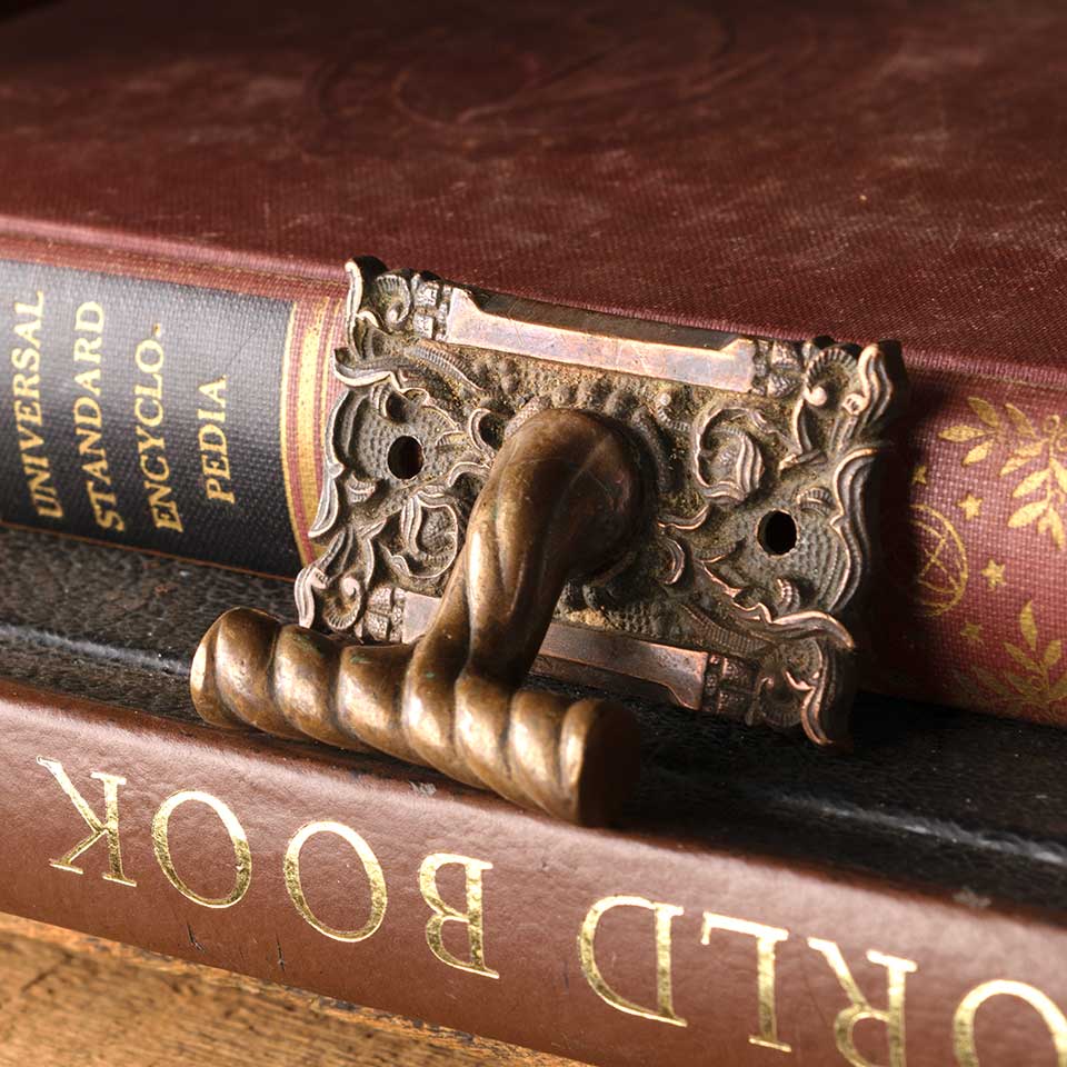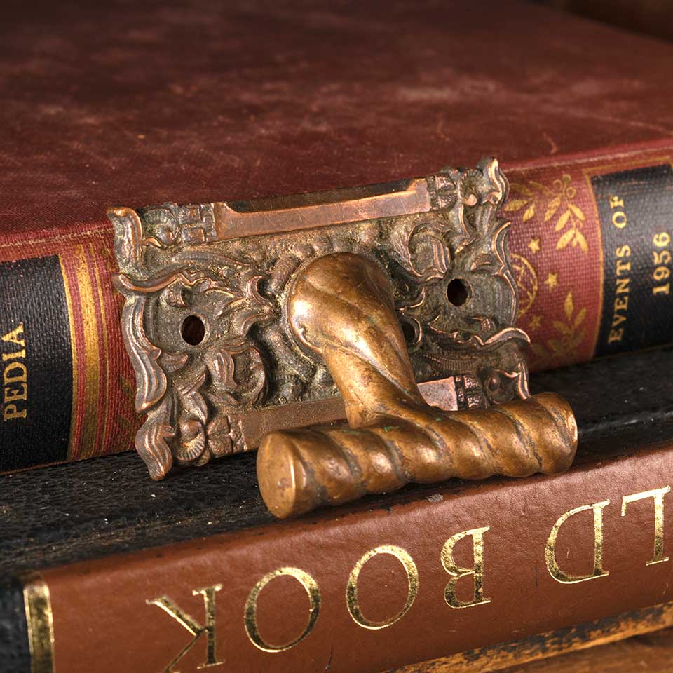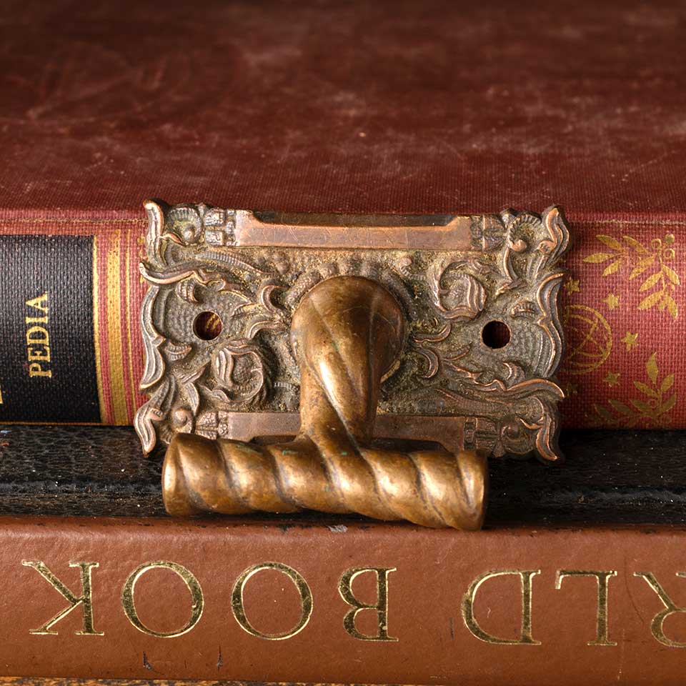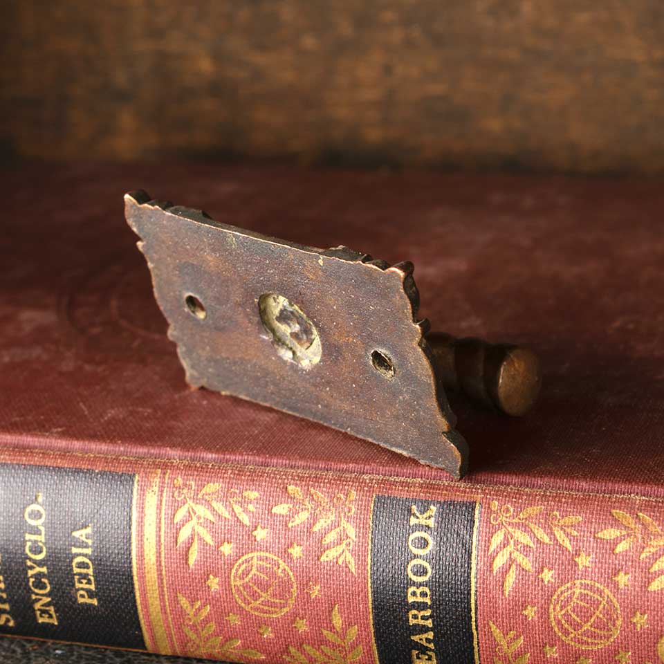 Architectural salvage antique cast bronze ornate window sash finger lift hardware measuring approx. 2 1/8" wide x 1 1/2" tall x 1" front to back. See photos to evaluate condition.
