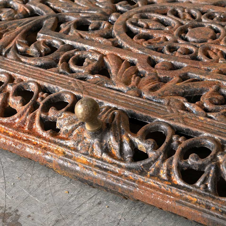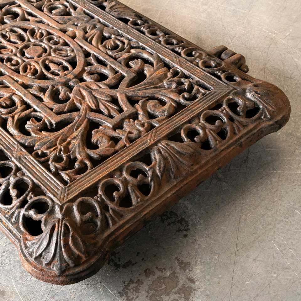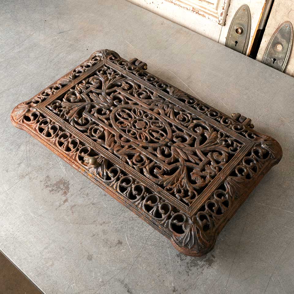 Antique architectural salvage ornate cast iron hinged stove top measuring approx. 25" wide x 3" tall x 16" front to back. See photos to evaluate condition.
