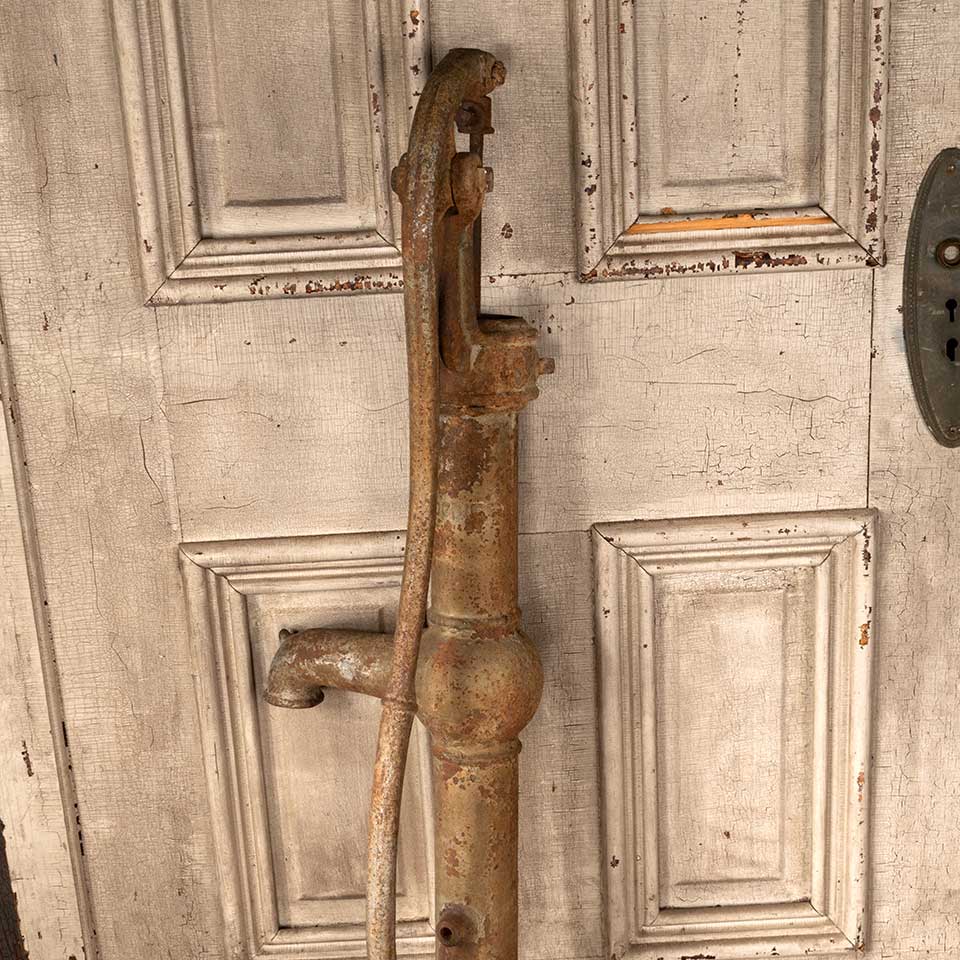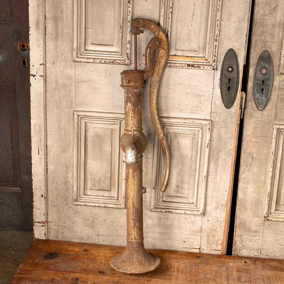 Architectural salvage antique cast iron farm water pump measuring approx. 12" wide x 41" tall x 12" front to back with an 8 3/4" diameter base. See photos to evaluate condition.