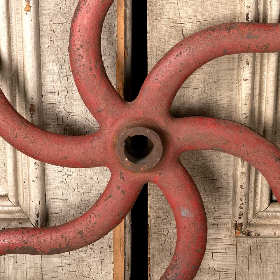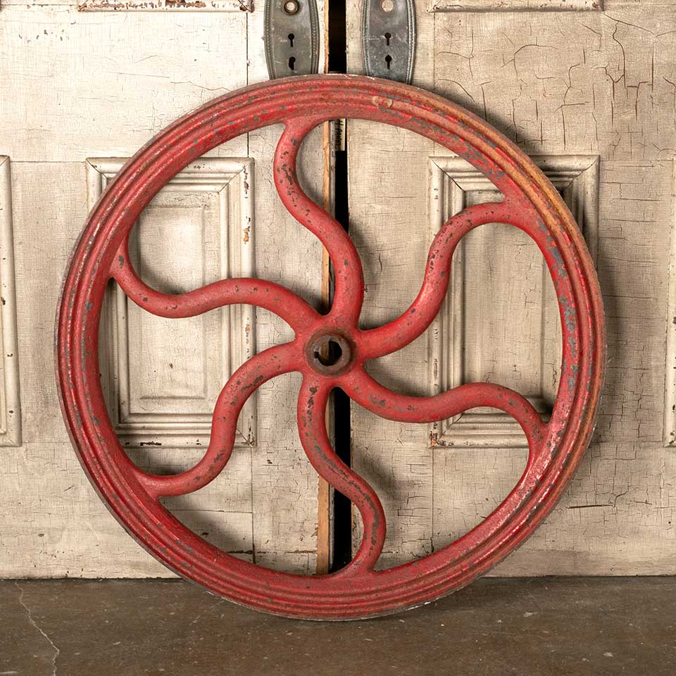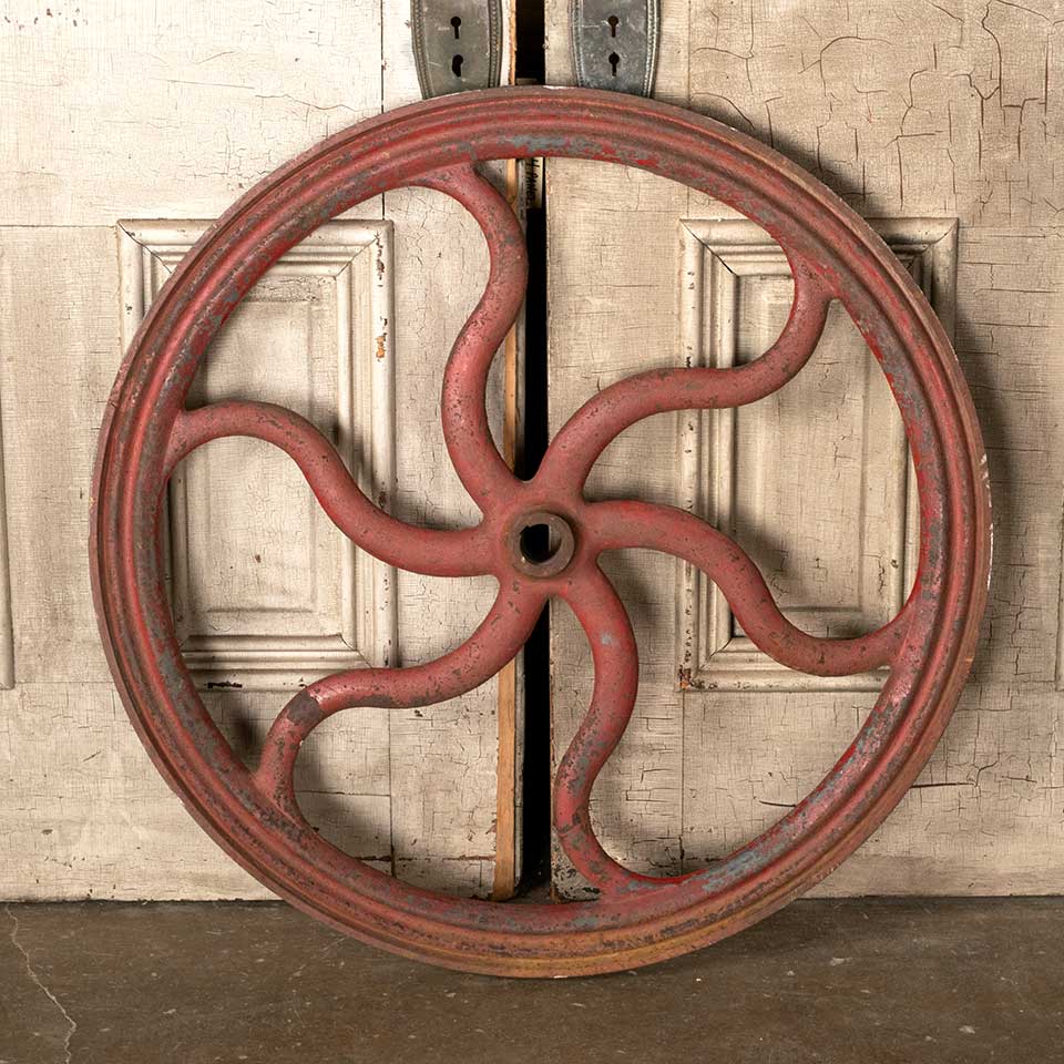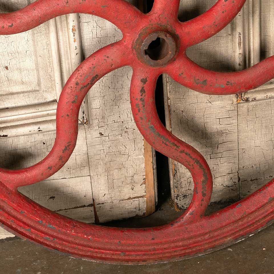 Architectural salvage antique cast iron belt wheel measuring approx. 31 3/4" in diameter x 1 1/2" thick (2 1/2" thick at center). See photos to evaluate condition.