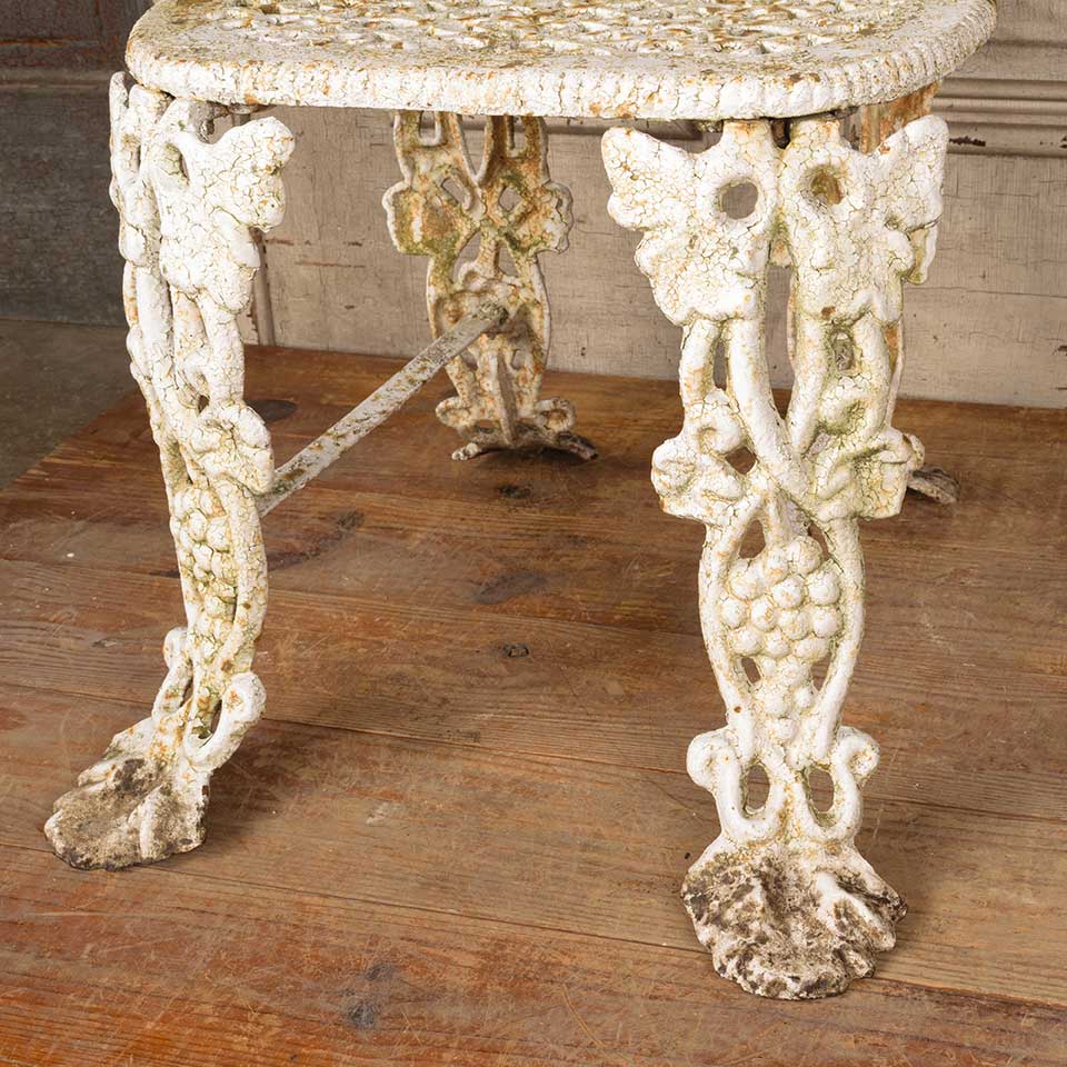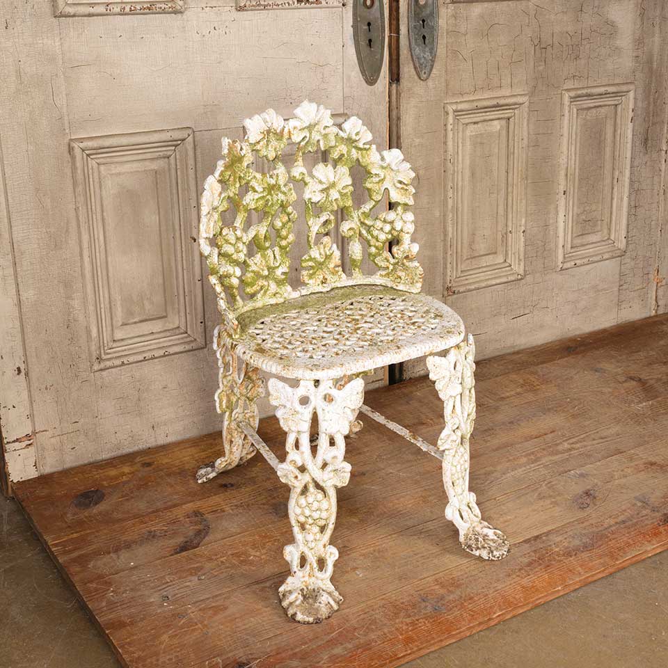 Architectural salvage vintage painted cast iron garden patio chair with grape vine motif measuring approx. 18" wide x 28 3/4" tall x 20 1/2" front to back. There's some paint loss. See photos to evaluate condition.