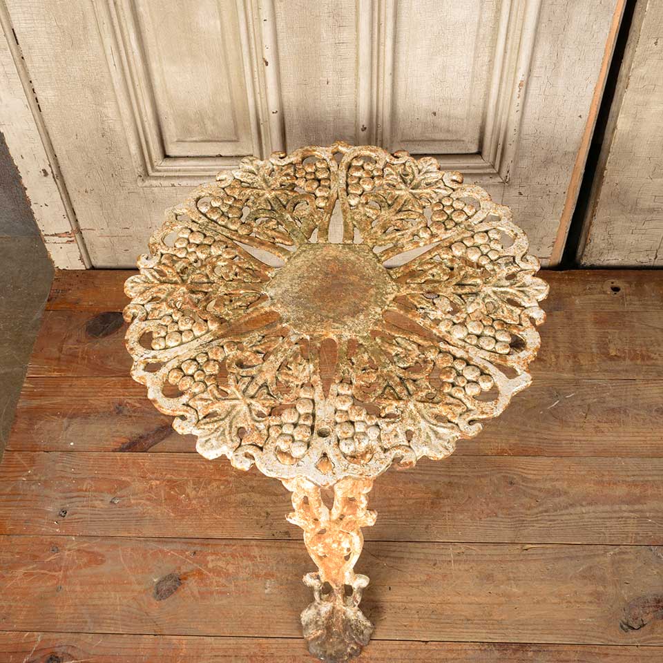 Architectural salvage vintage painted cast iron garden table with grape motif measuring approx. 14 3/8" tall with a 20 1/2" diameter top and a 25" diameter base. See photos to evaluate condition.