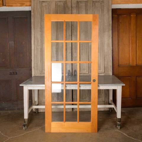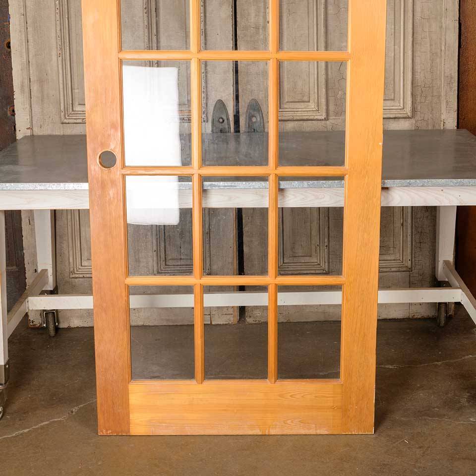 Architectural salvage fifteen lite pine wood interior French door measuring approx. 35 3/4" wide x 80" tall x 1 3/8" thick. This is not an antique door. See photos to evaluate condition.