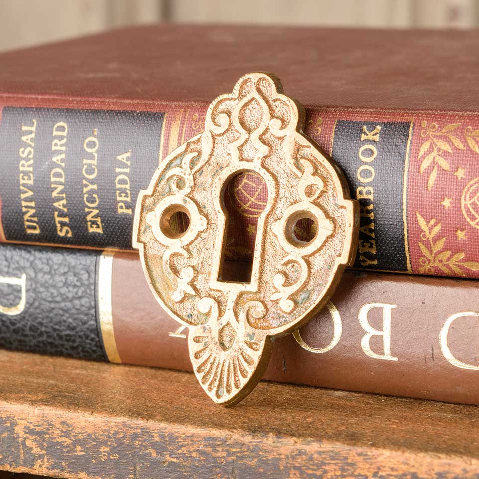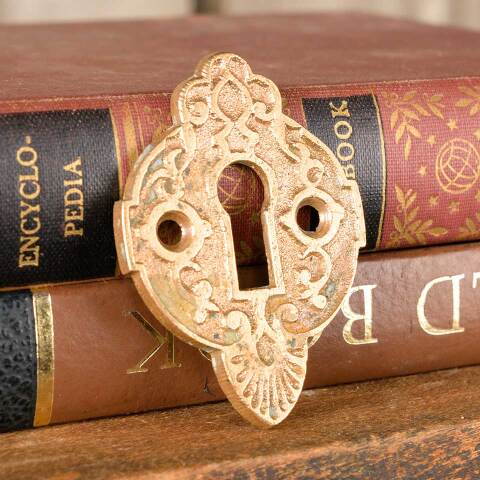 Architectural salvage antique ornate bronze door keyhole escutcheon cover plate hardware measuring approx. 1 5/8" wide x 2 1/4" tall. See photos to evaluate condition.