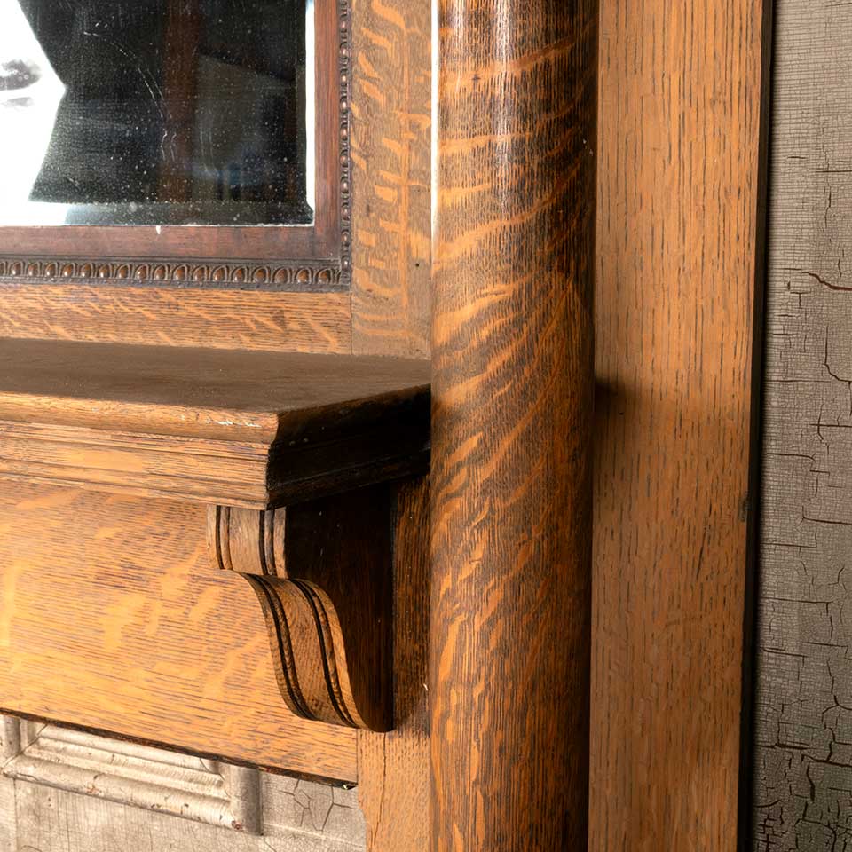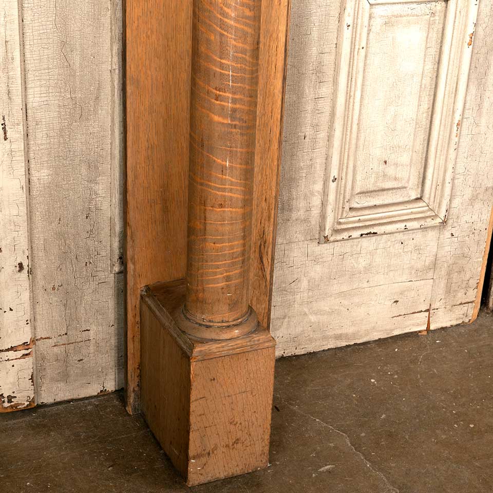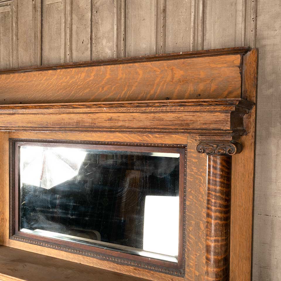 Architectural salvage antique oak fireplace mantel / mantle with columns and beveled glass mirror measuring approx. 58" wide x 84 1/2" tall x 9 1/4" front to back. The interior firebox opening measures approx. 41 3/8" wide x 39 1/8" tall. See photos to evaluate condition.