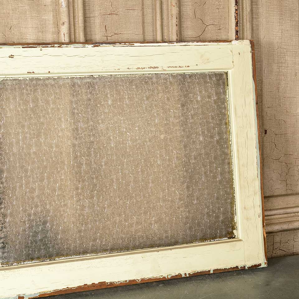Architectural salvage antique painted wood transom window with Florentine pressed privacy glass measuring approx. 41" wide x 18 1/2" tall x 1 3/8" thick. See photos to evaluate condition.