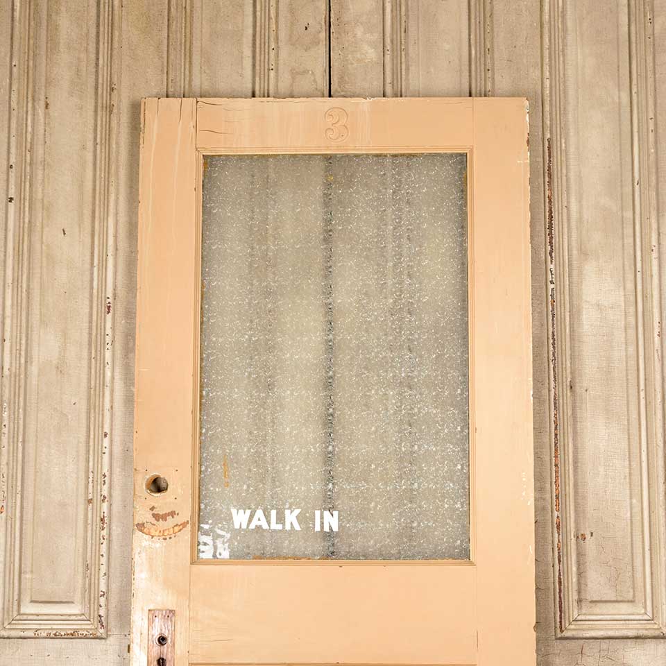 Architectural salvage antique painted wood interior half-lite door with mortise lock and Florentine privacy glass measuring approx. 34" wide x 81 3/4" tall x 1 3/4" thick. See photos to evaluate condition.