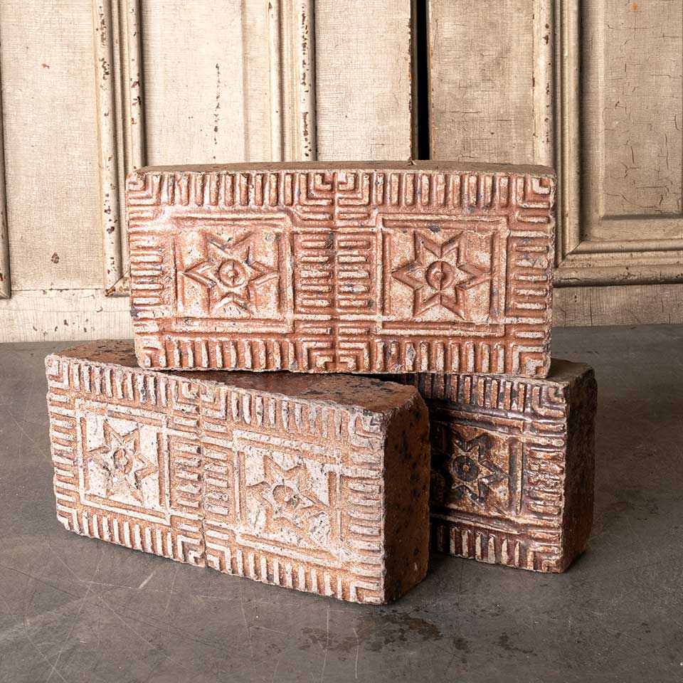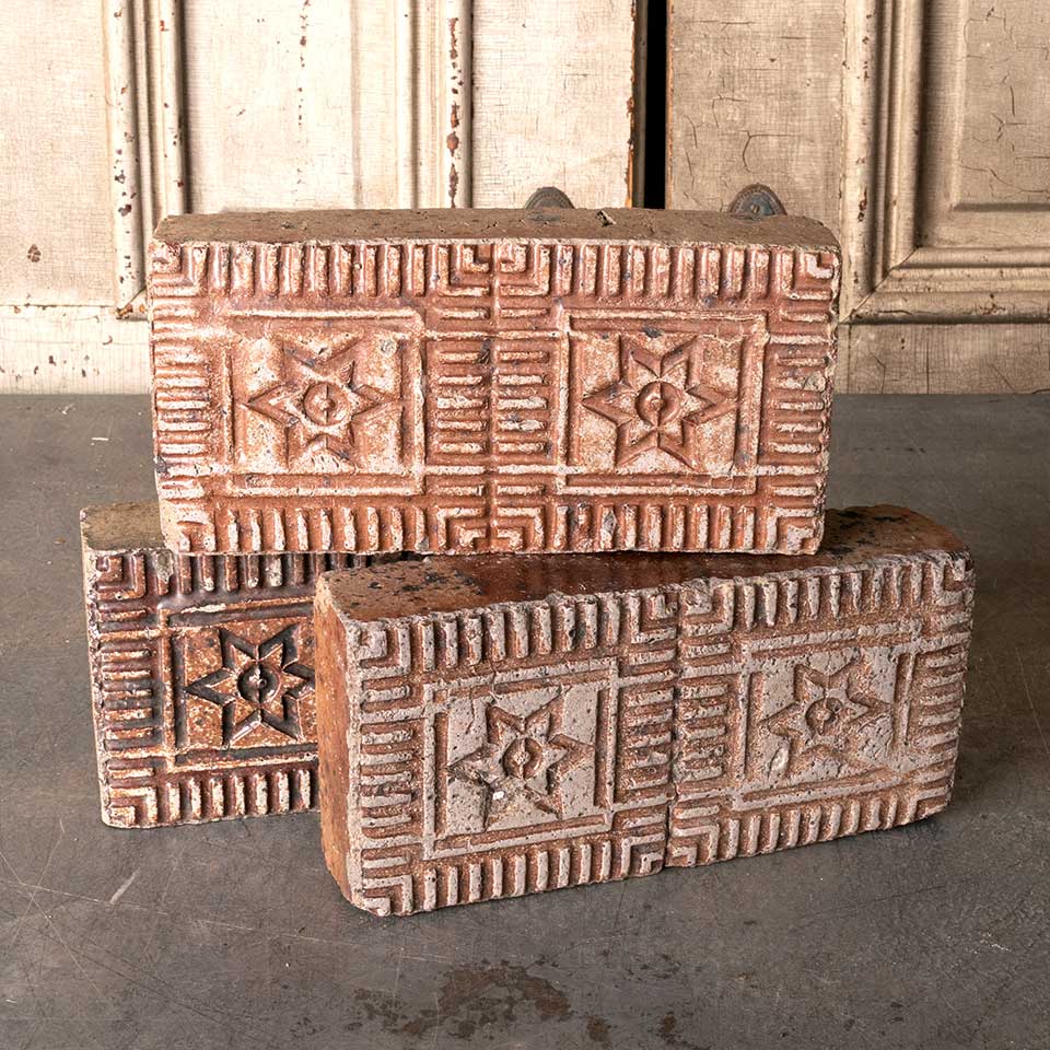 Architectural salvage antique salt glazed sidewalk paver brick with star pattern measuring approx. 10 1/4" wide x 4 7/8" tall x 2 1/2" thick. Color and condition varies.