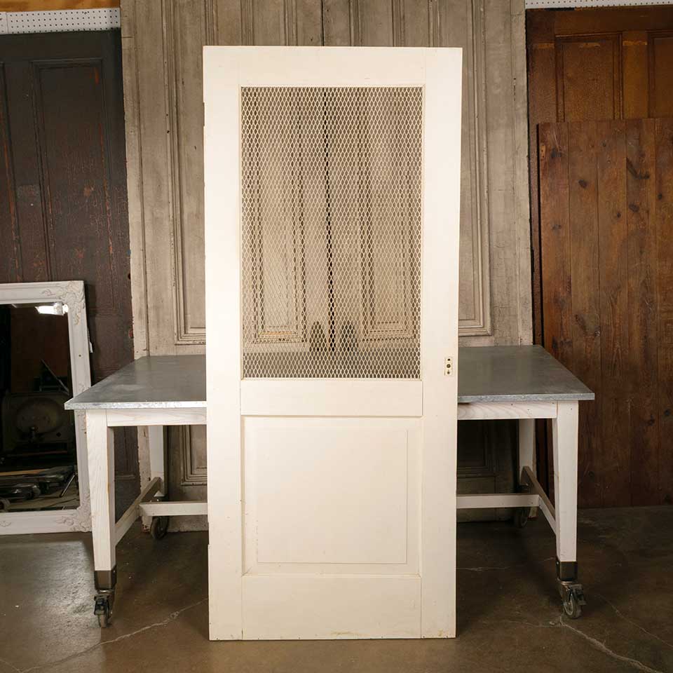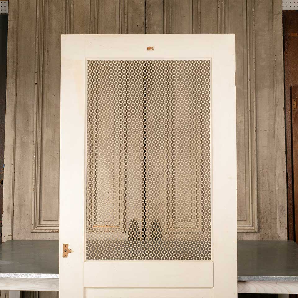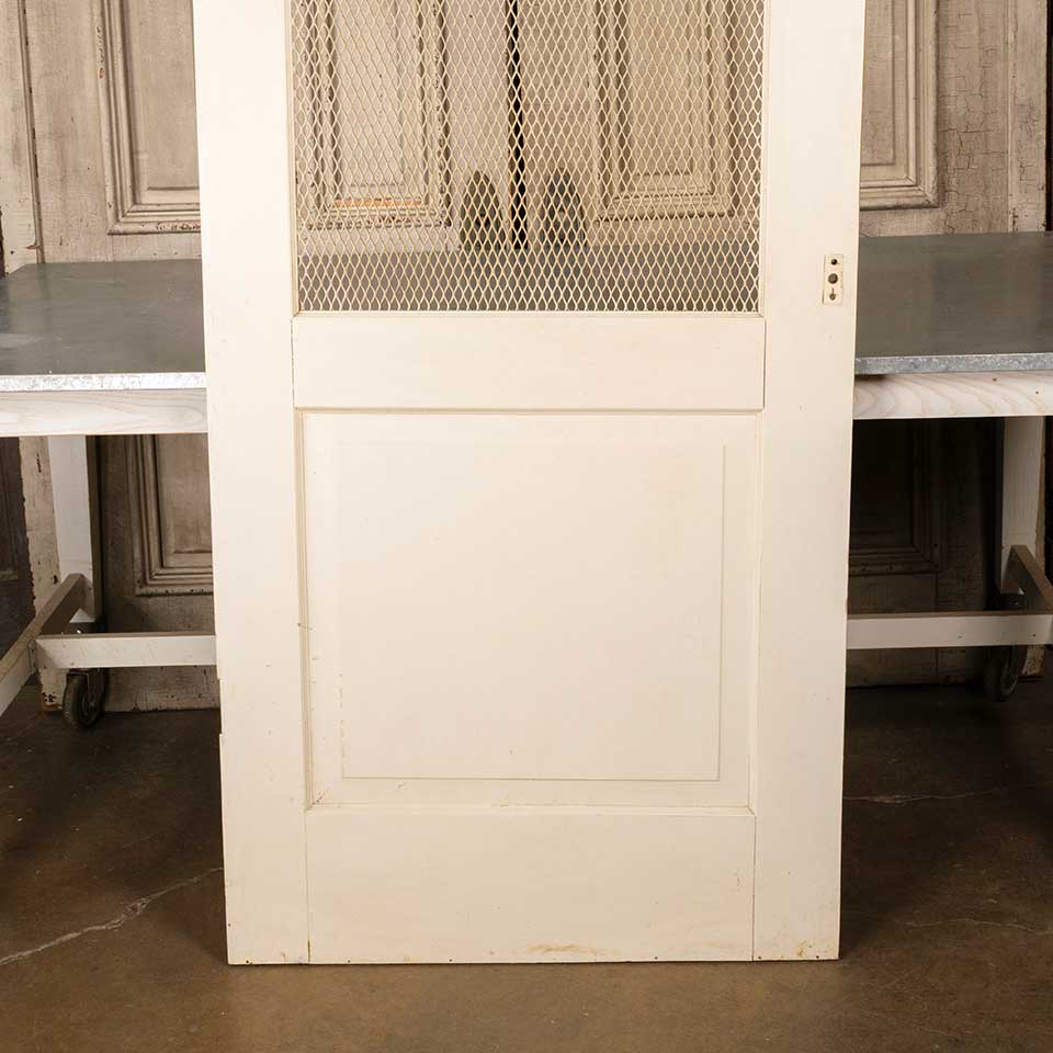 Architectural salvage vintage painted wood door with metal wire screen panel measuring approx. 33 3/4" wide x 79 1/8" tall x 1 1/8" thick. See photos to evaluate condition.