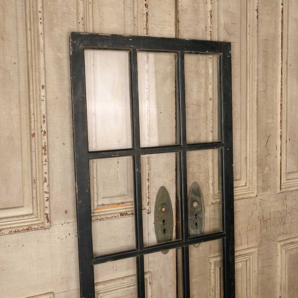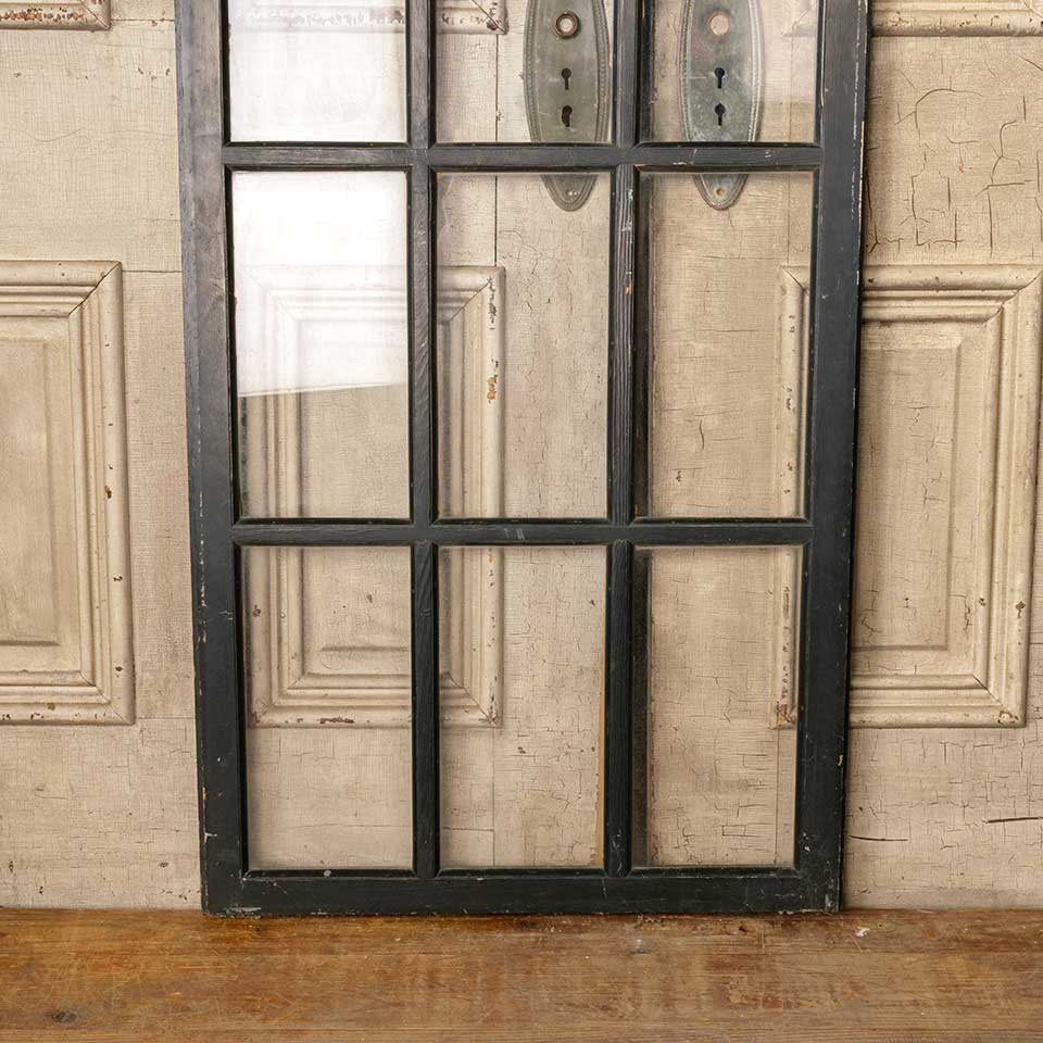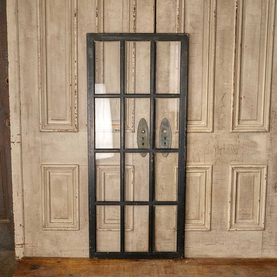 Architectural salvage antique divided twelve lite wood storm door panel measuring approx. 24 1/8" wide x 56 3/4" tall x 3/4" thick (insert dimensions) and 24 13/16" wide x 57 7/16 x 1 1/16" front to back (overall dimensions). See photos to evaluate condition.