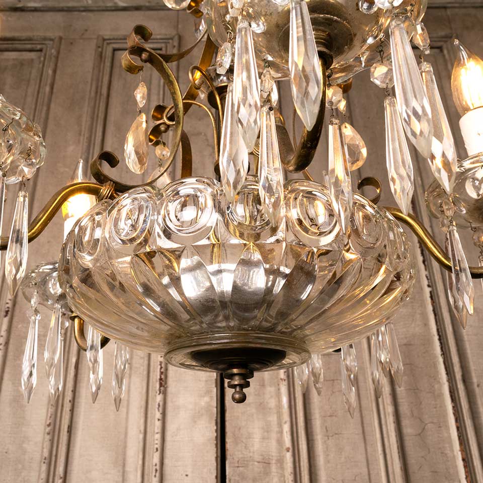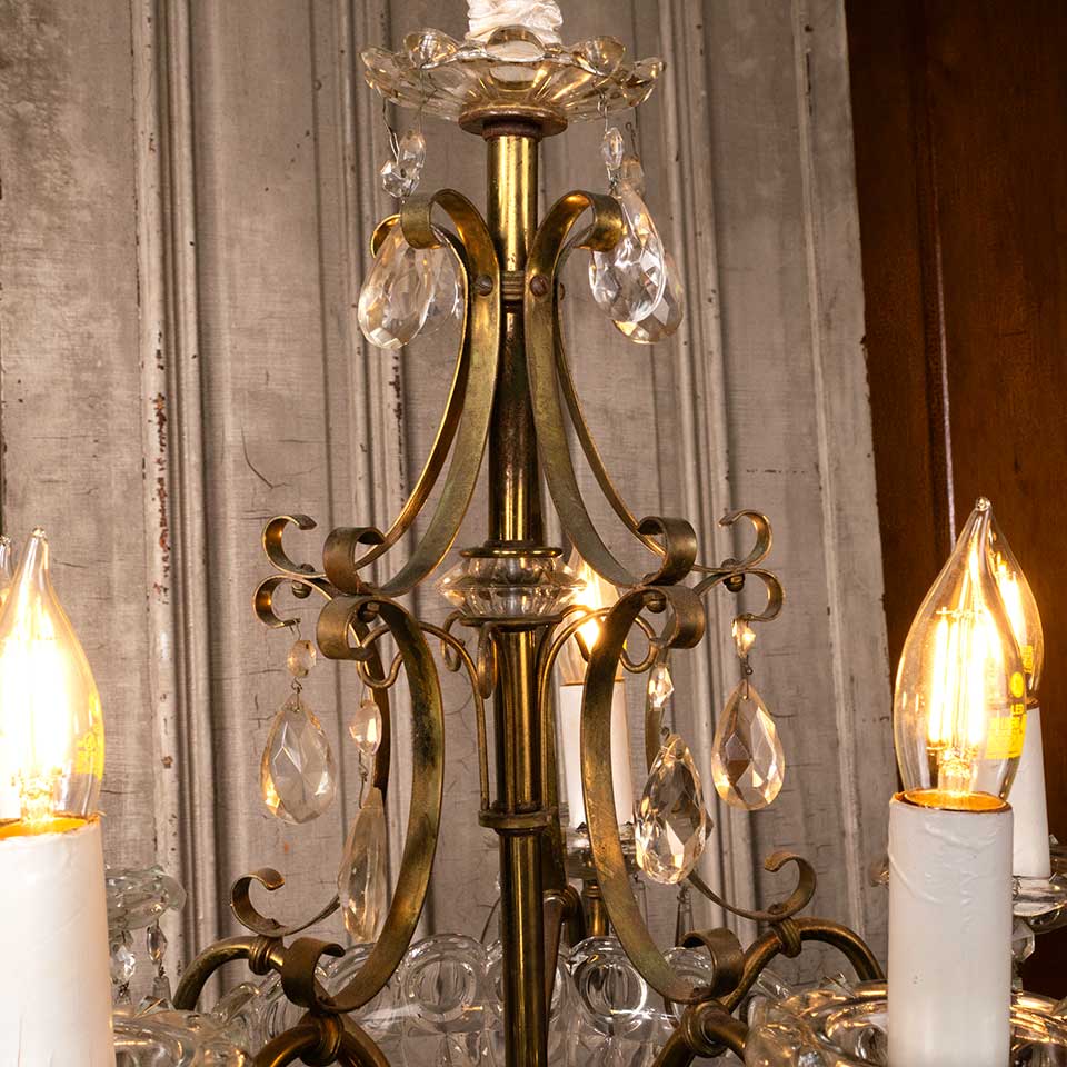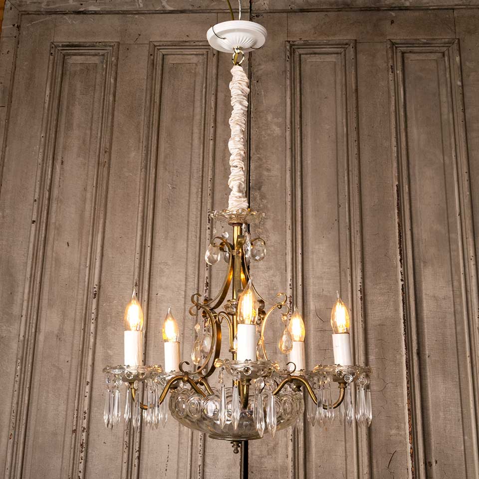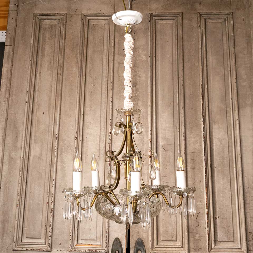 Architectural salvage five light chandelier with glass prisms measuring approx. 19 1/2" in diameter x 31" tall. See photos to evaluate condition. Salvaged lighting should be inspected by a licensed electrician prior to installation.