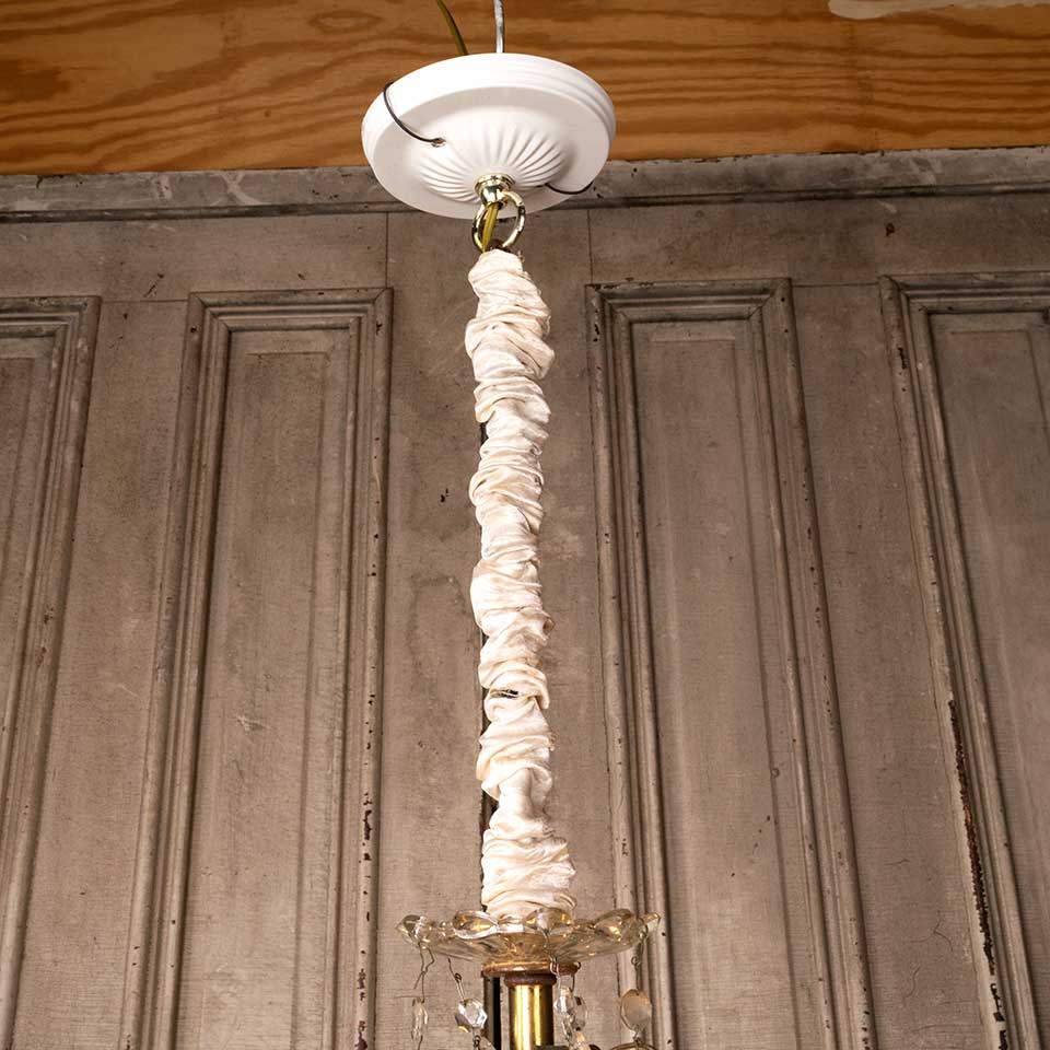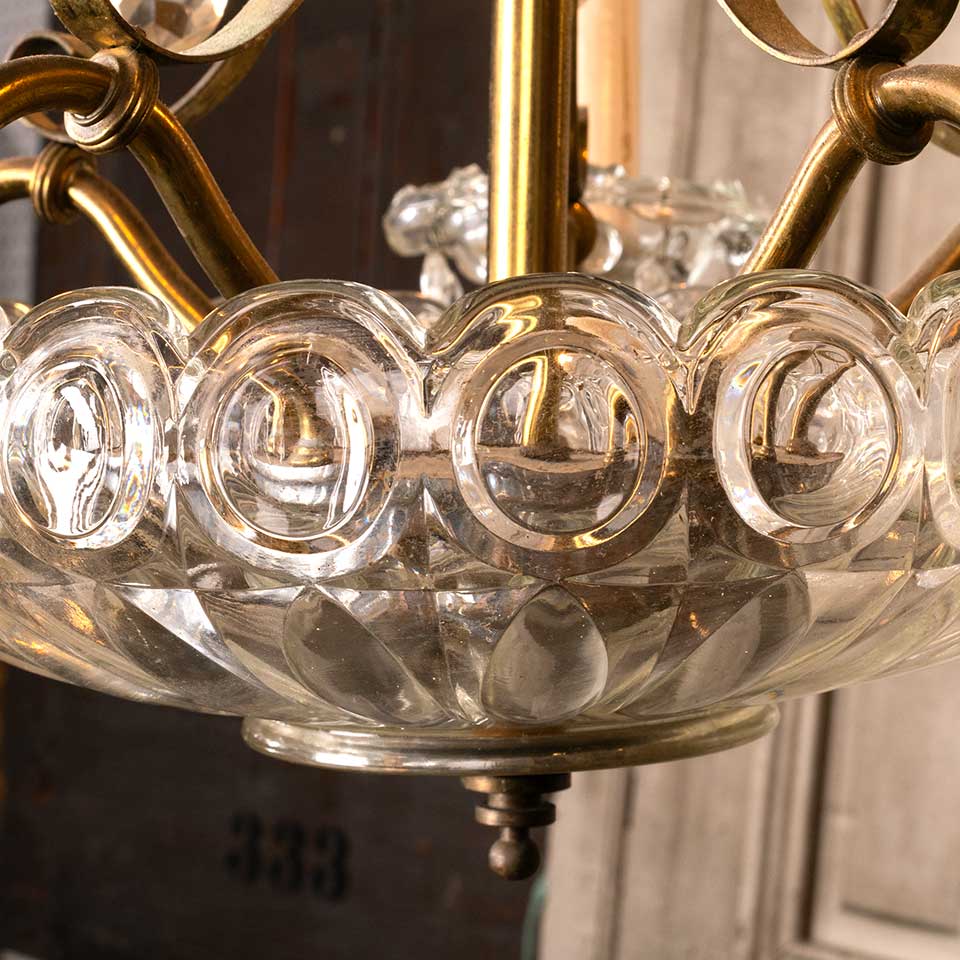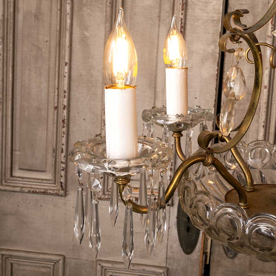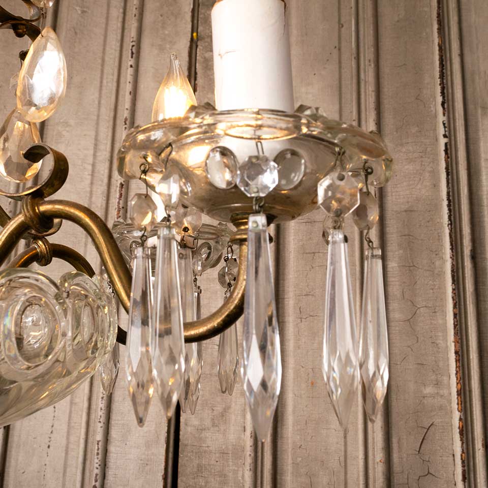 Architectural salvage five light chandelier with glass prisms measuring approx. 19 1/2" in diameter x 31" tall. See photos to evaluate condition. Salvaged lighting should be inspected by a licensed electrician prior to installation.