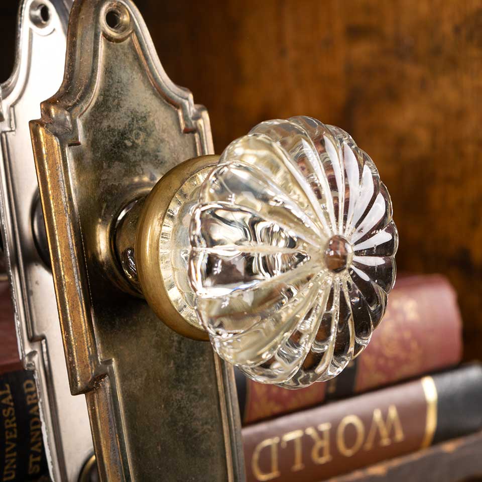 Antique architectural salvage glass, chrome and brass bathroom door hardware set. The set includes two glass doorknobs with a daisy design (1 7/8" diameter), a threaded spindle with set screws, one chrome backplate (1 5/8 x 6 ") with a thumb turn, one brass backplate (1 5/8 x 6"), a thumb turn mortise lock (5/8" x 3 5/8" x 1/8" faceplate) and a 5/8" x 3 5/8" x 3" body with a 2 1/2" backset, and a chrome strike plate. Distance between the spindle and keyholes is 2 1/4". See photos to evaluate condition. Priced at $225 for the set.