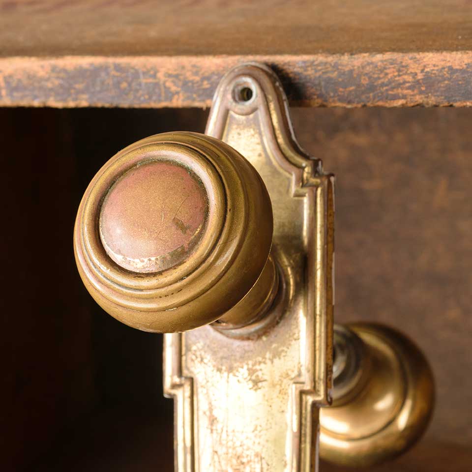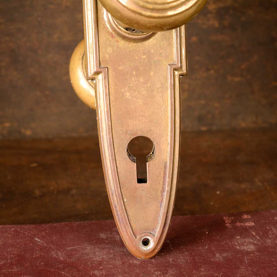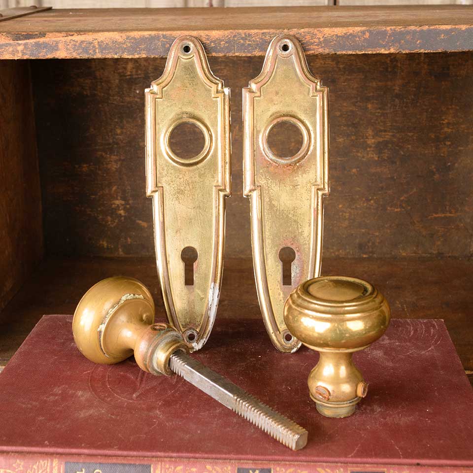 Architectural salvage antique brass interior doorknob door hardware set. Includes a two doorknobs (1 5/8" in diameter), two backplates (1 5/8" x 6" with the spindle and keyholes measuring 2 1/2" on centers), and a threaded spindle with set screws. See photos to evaluate condition. Priced at $125 for the set.
