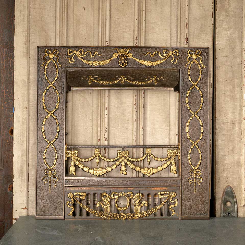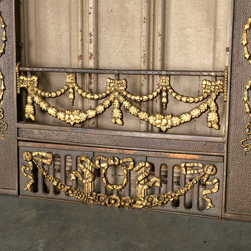 Architectural salvage antique painted cast iron fireplace surround with hood and ember screen measuring approx. 30 1/2" wide x 31 1/2" tall x 4 3/4" front to back. The interior firebox opening measures approx. 20 1/8" wide x 25 1/2" tall . See photos to evaluate condition.