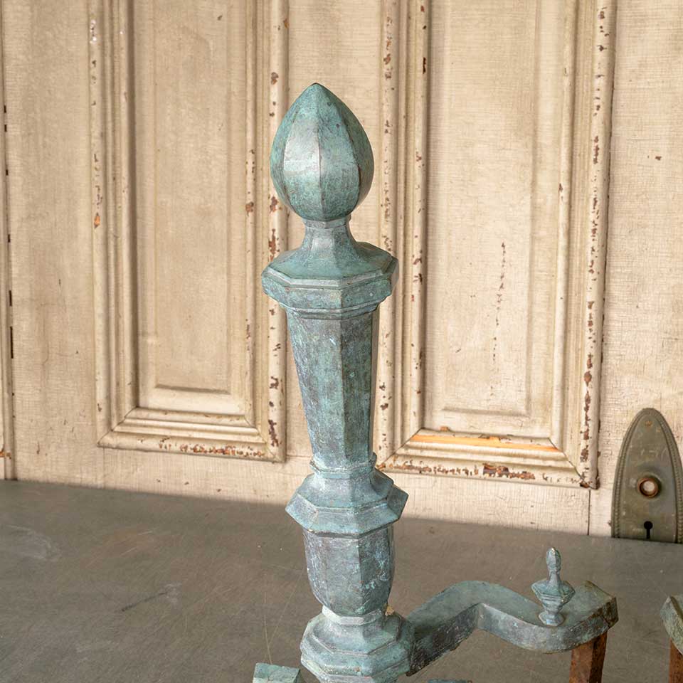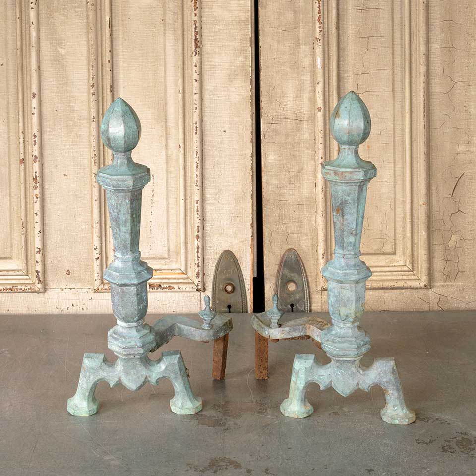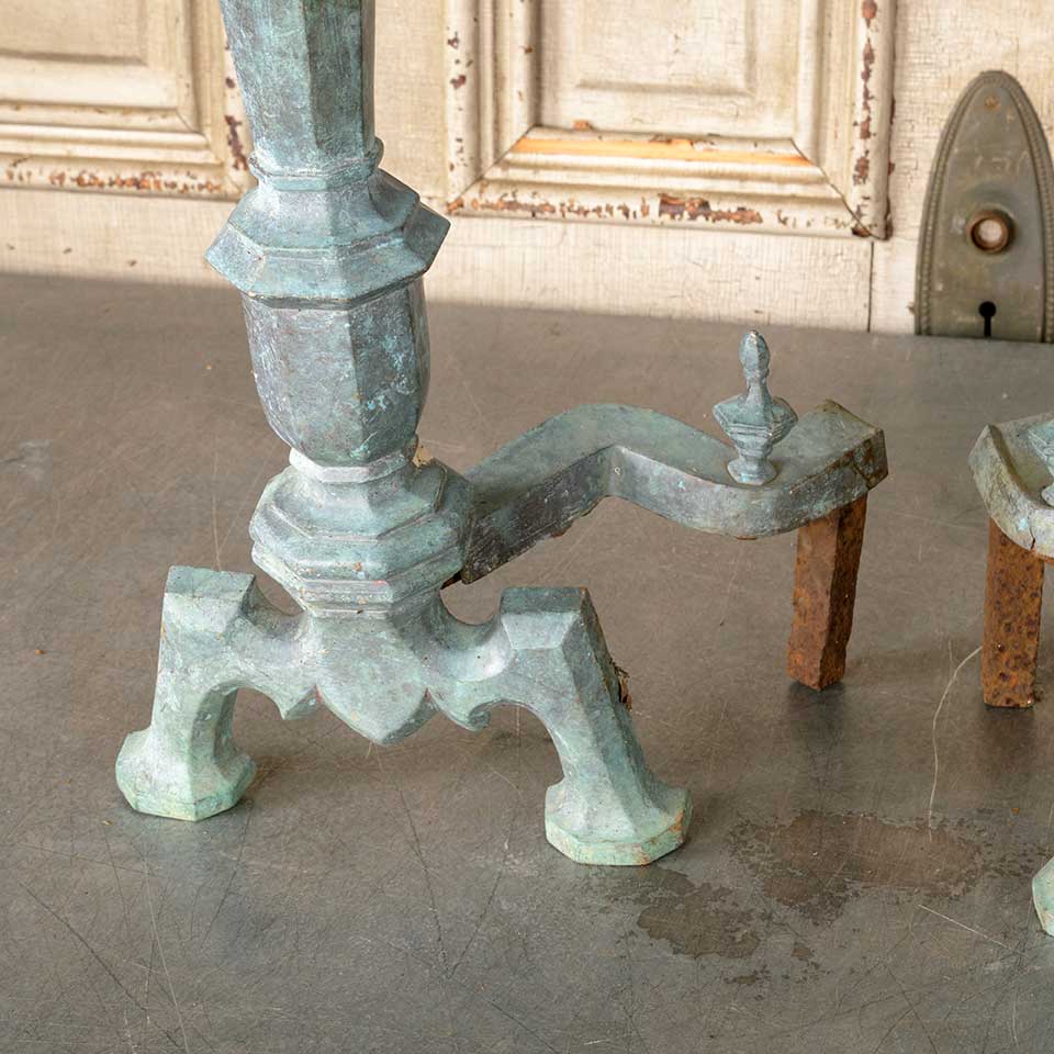 Pair of architectural salvage antique fireplace andirons each measuring approx. 10 1/2" wide x 20 1/2" tall x 9 1/2" front to back. There are some condition issues. See photos to evaluate condition.