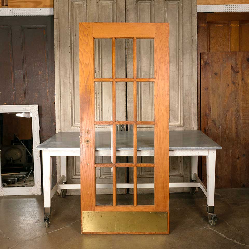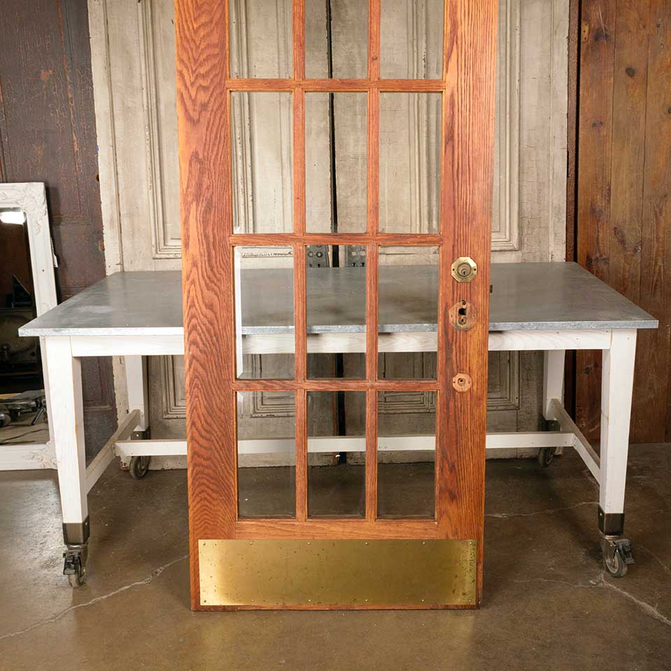 Architectural salvage antique twelve lite French entry door with beveled glass panes and mortise lock measuring approx. 34" wide x 80 1/2" tall x 1 3/4" thick. See photos to evaluate condition.
