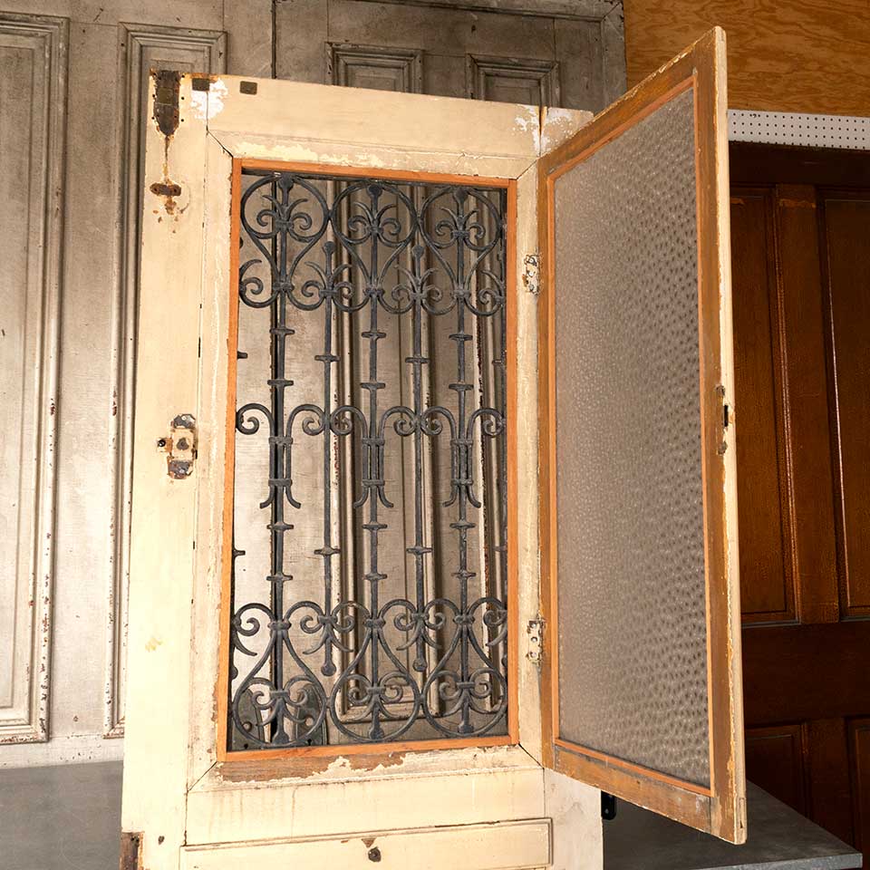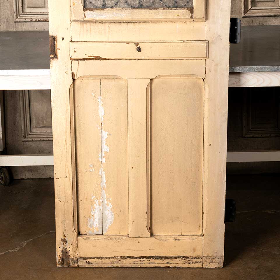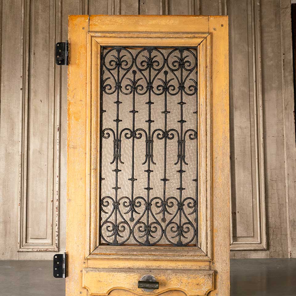 Architectural salvage antique French country oak wood door with wrought iron window grill and pressed Florentine privacy glass measuring approx. 28" wide x 82 1/4" tall x 1 3/8" thick. See photos to evaluate condition.