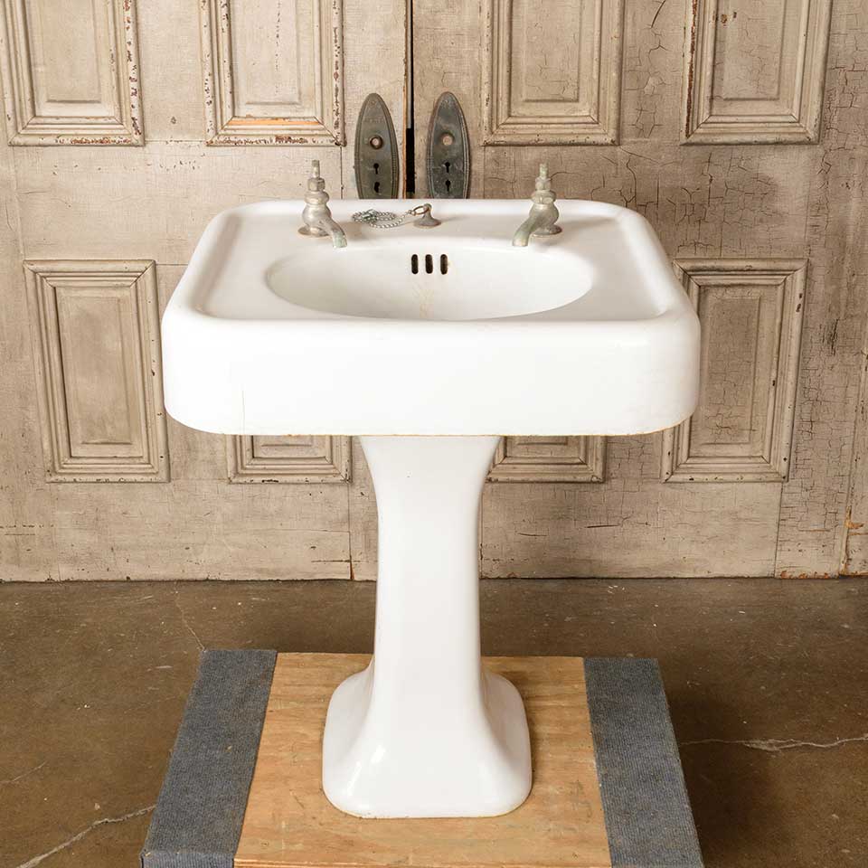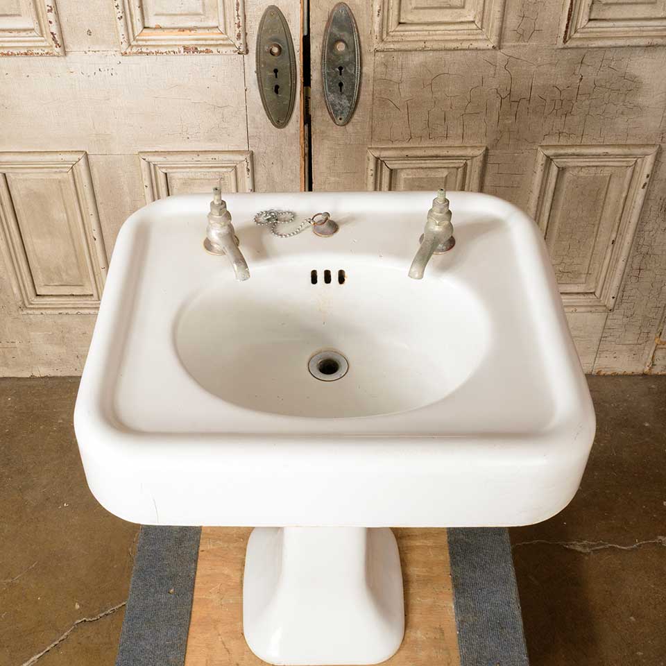 Architectural salvage cast iron porcelain enameled bathroom pedestal sink measuring approx. 24" wide x 30 1/2" tall x 19 1/2" front to back. Fixtures are included, but not guaranteed to be in working order. See photos to evaluate condition.