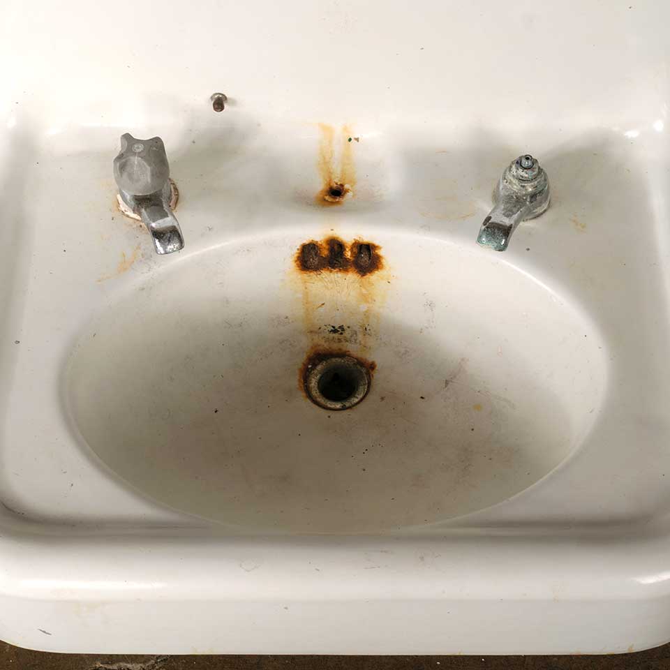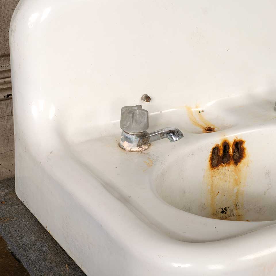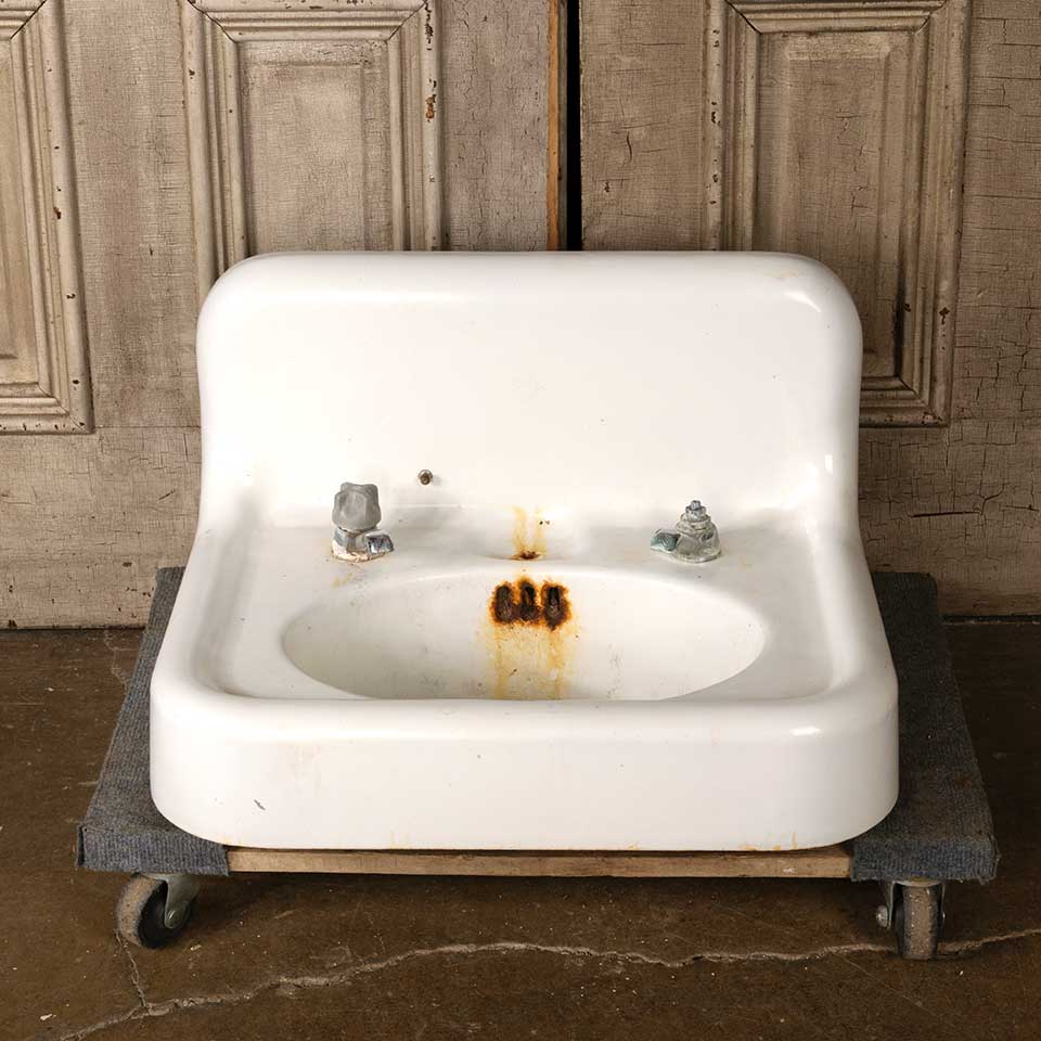 Architectural salvage antique cast iron porcelain enameled wall mount bathroom sink measuring approx. 24 1/2" wide x 18" tall x 18" front to back. The wall mounting bracket is included. The fixtures are included, but not guaranteed to be in working order. See photos to evaluate condition.