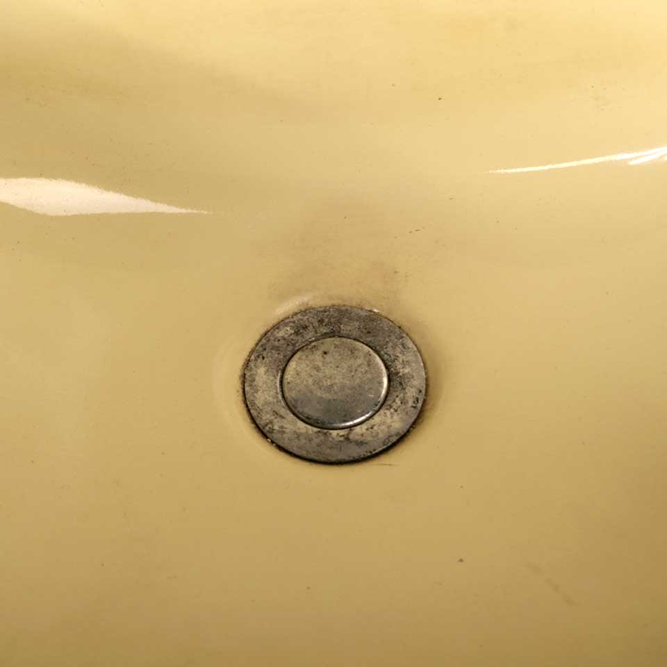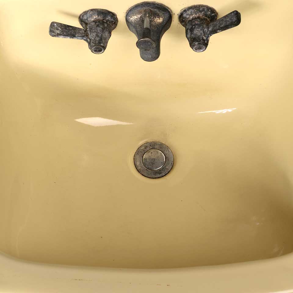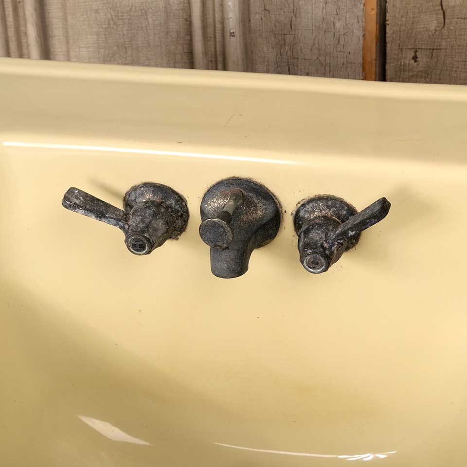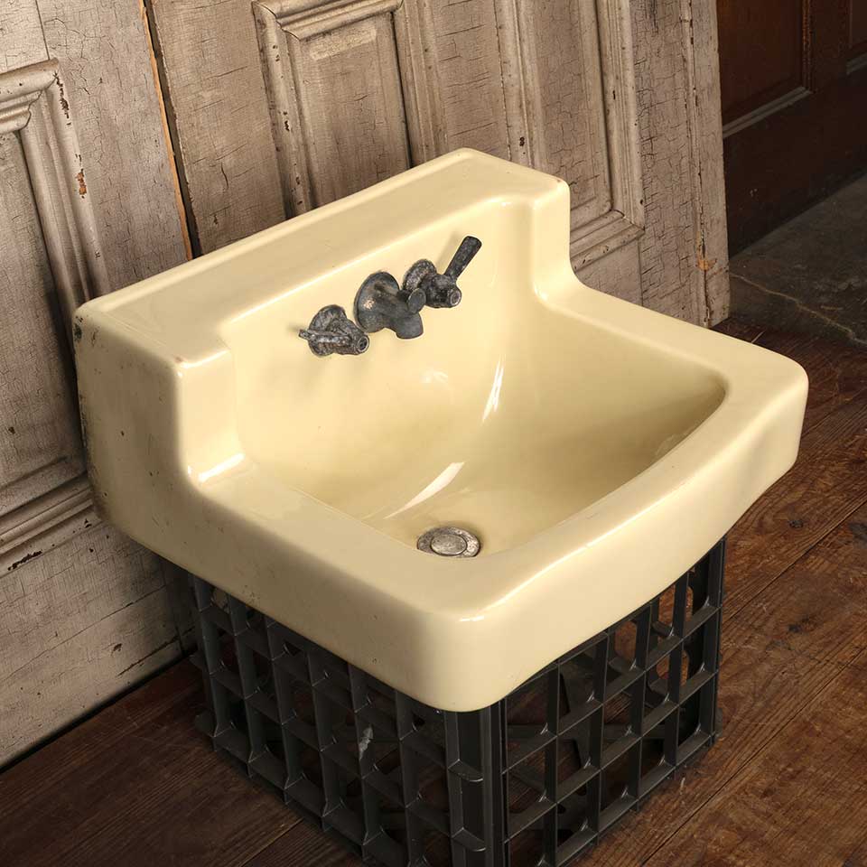 Architectural salvage vintage porcelain wall mount bathroom sink measuring approx. 19" wide x 11 1/2" tall x 16 3/4" front to back. The wall mounting brackets are included. There's a hairline crack in the porcelain at the bottom left corner. The fixtures are included, but not guaranteed to be in working order. See photos to evaluate condition.