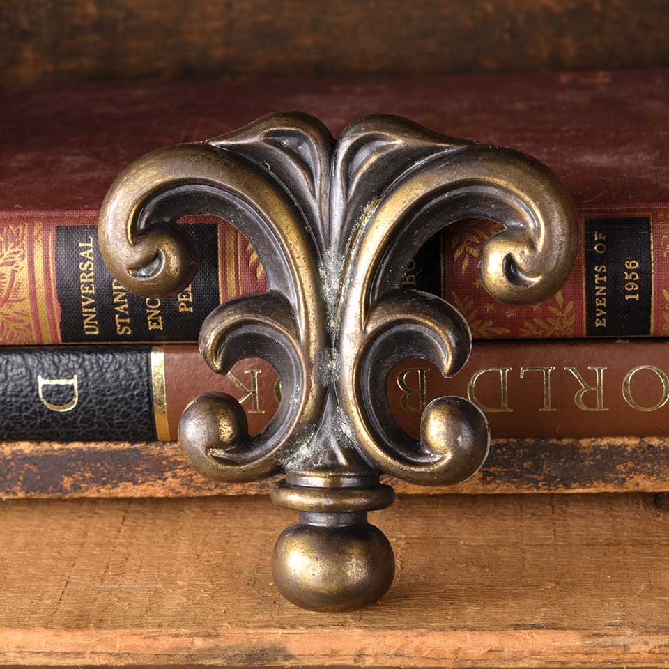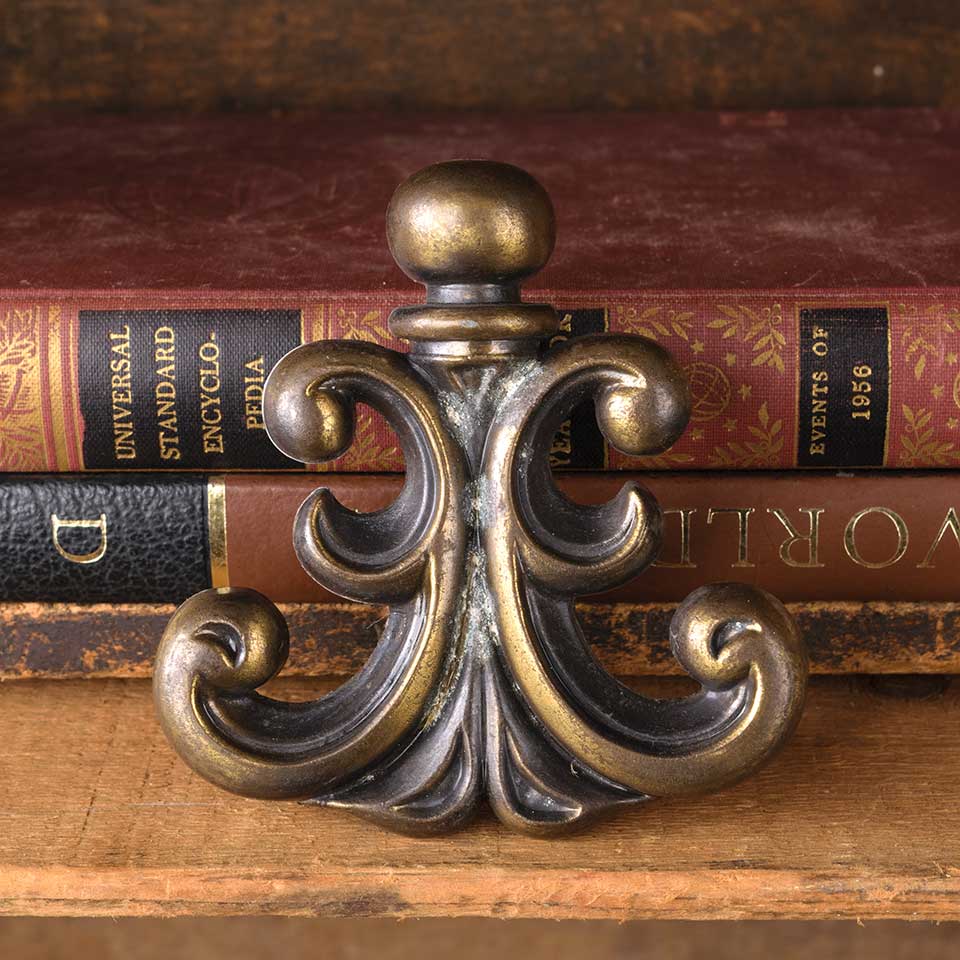 Architectural salvage vintage brass drawer knob pull handle furniture hardware measuring approx. 3 5/8" wide x 3 3/4 tall x 1 1/4" front to back with mounting holes 2" on centers. Mounting screws NOT included. Color and condition vary.
