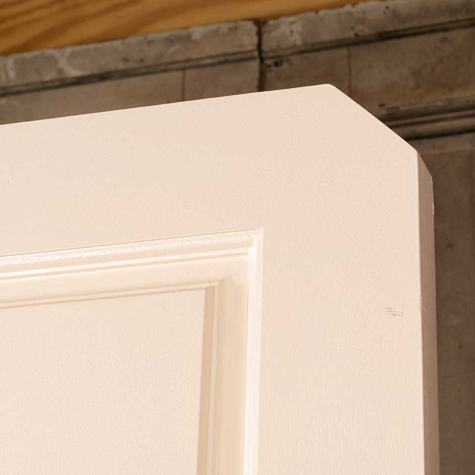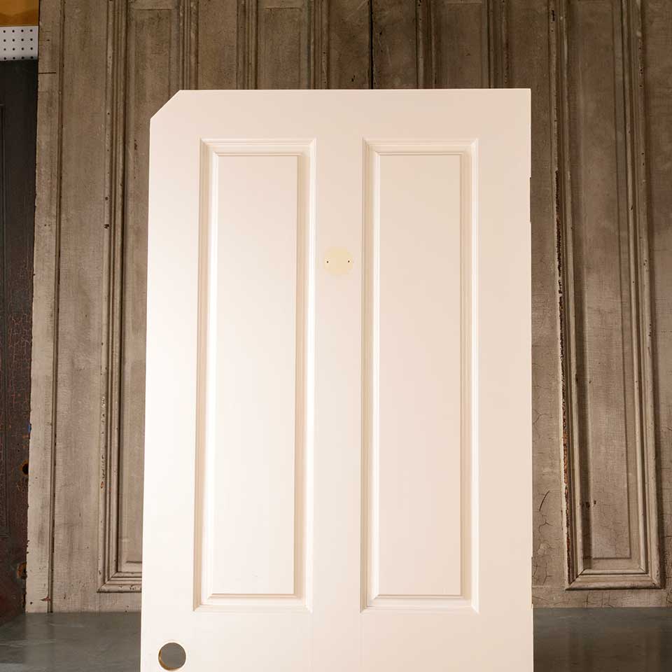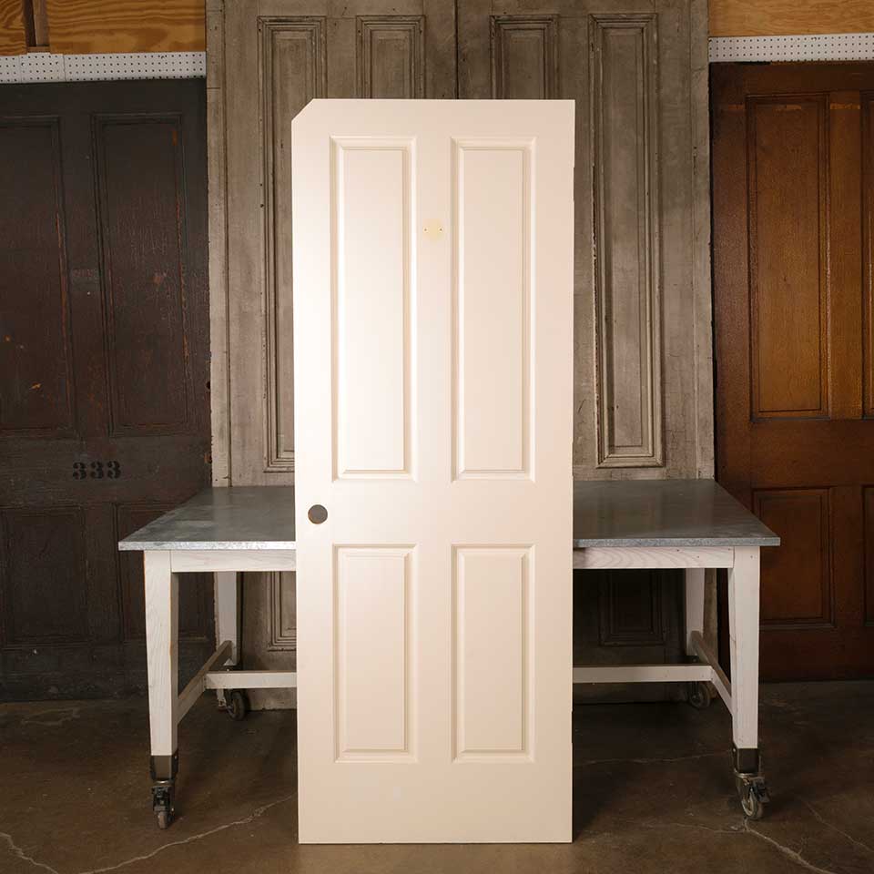 Architectural salvage four panel painted wood interior door measuring approx. 29 3/4" wide x 80" tall x 1 3/8" thick. This is not an antique door. One of the top corners is clipped. See photos to evaluate condition.