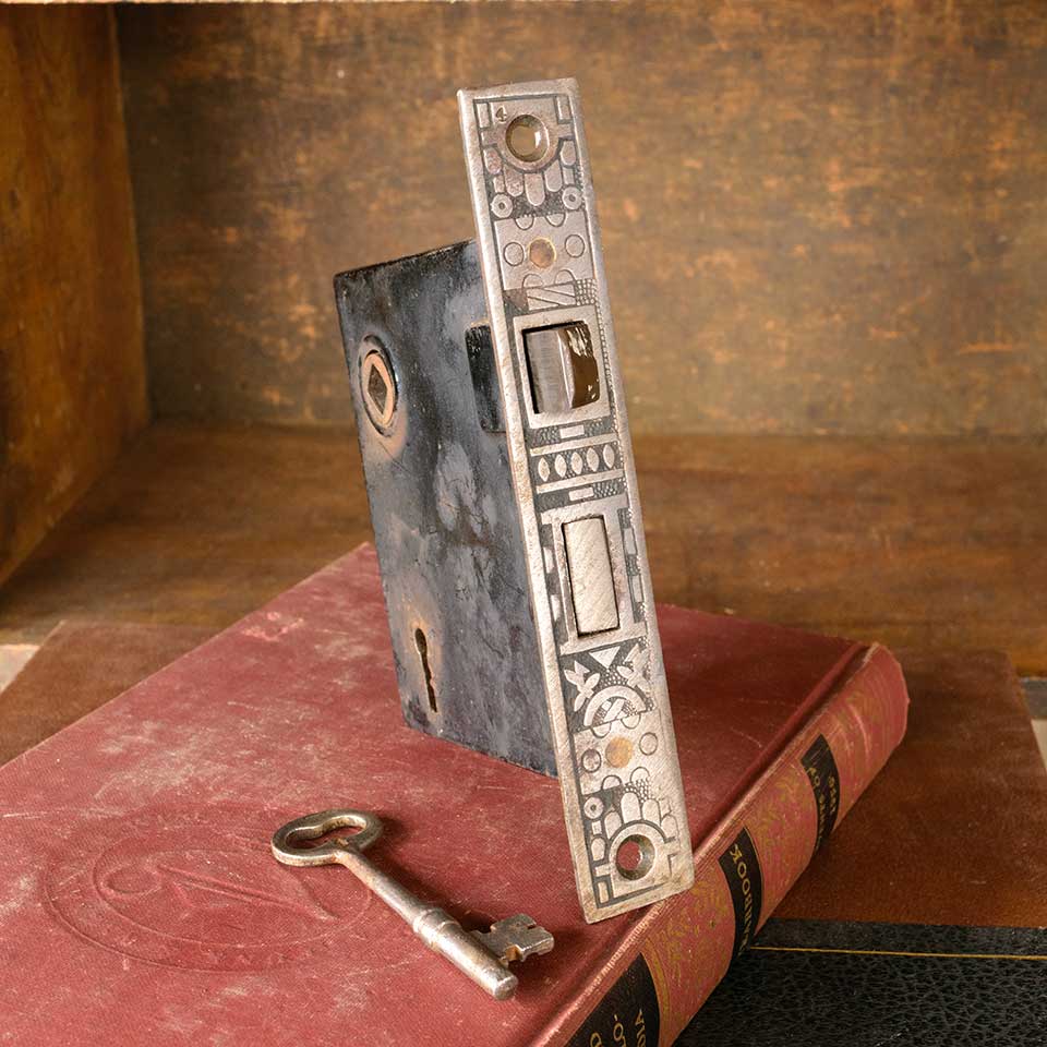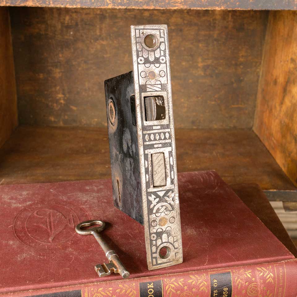 Architectural salvage antique Reading Hardware Co. Windsor pattern (c. 1897) cast iron reversible interior door mortise latch lock hardware set. Measurements: face plate 7/8" wide x 5 1/2" tall x 1/16" thick and body 5/8" wide x 3 3/4" tall x 3 1/8" front to back with a 2 1/2" backset. The distance between the spindle and keyholes is 2 1/2" on center. Skeleton key included. Color and condition may vary. Priced at $55/set.