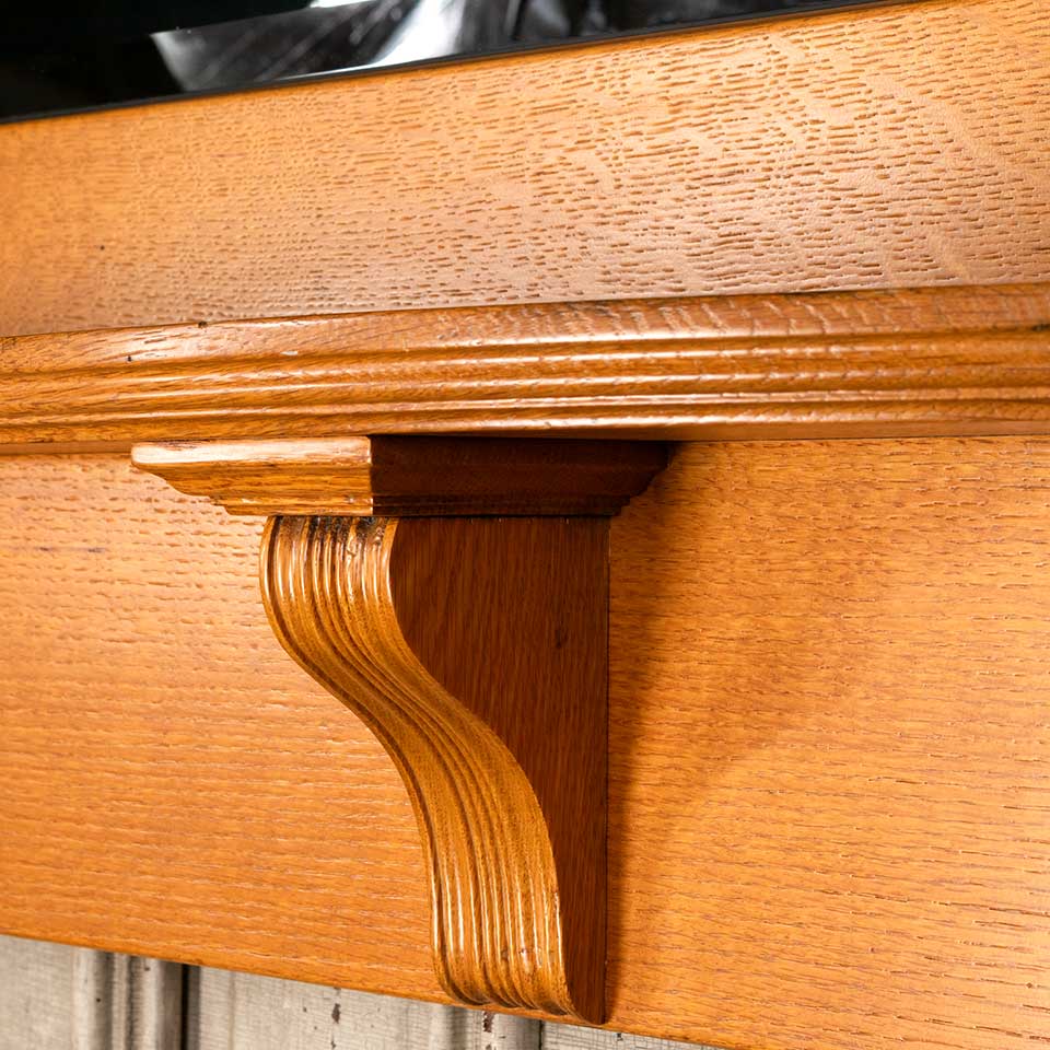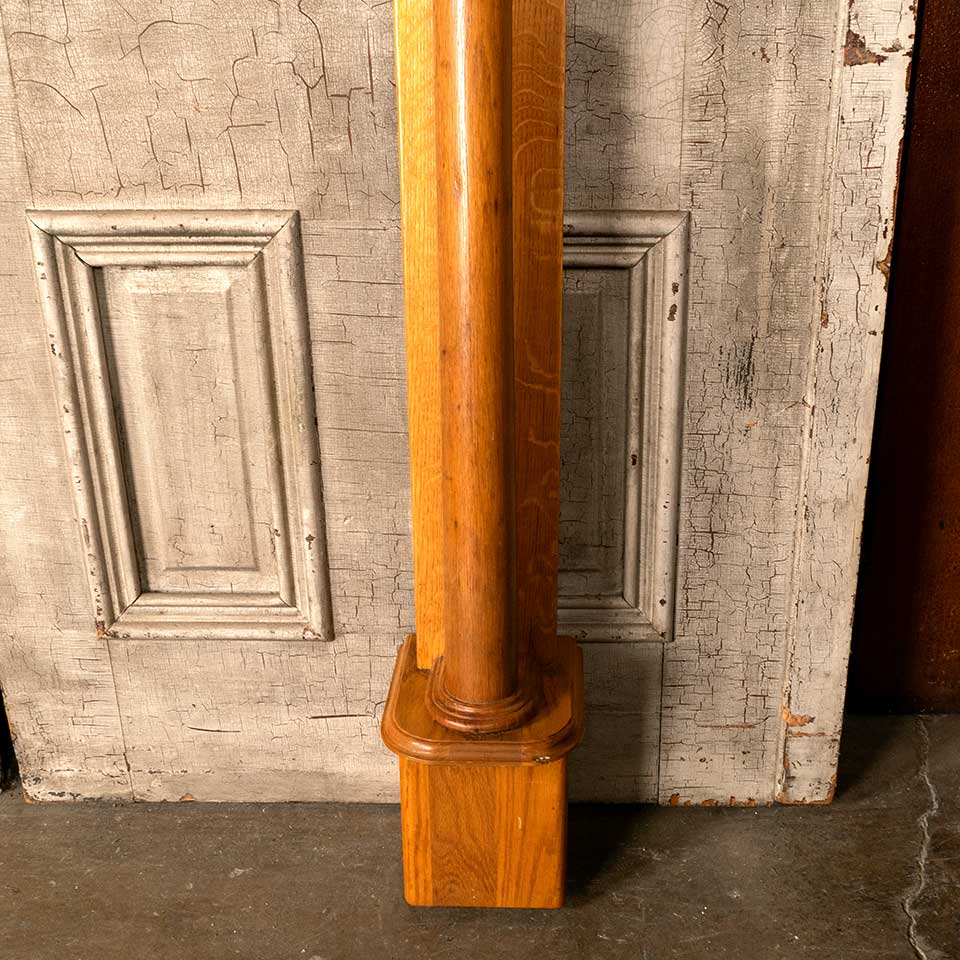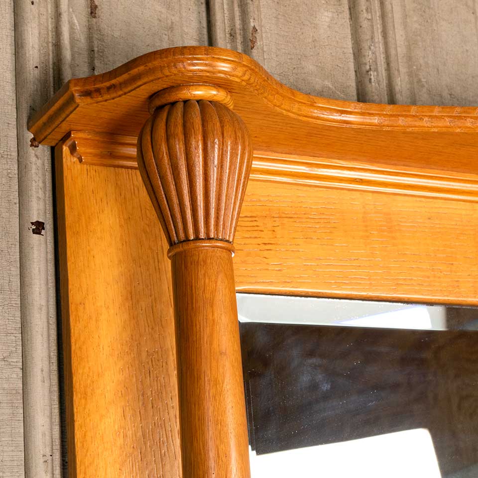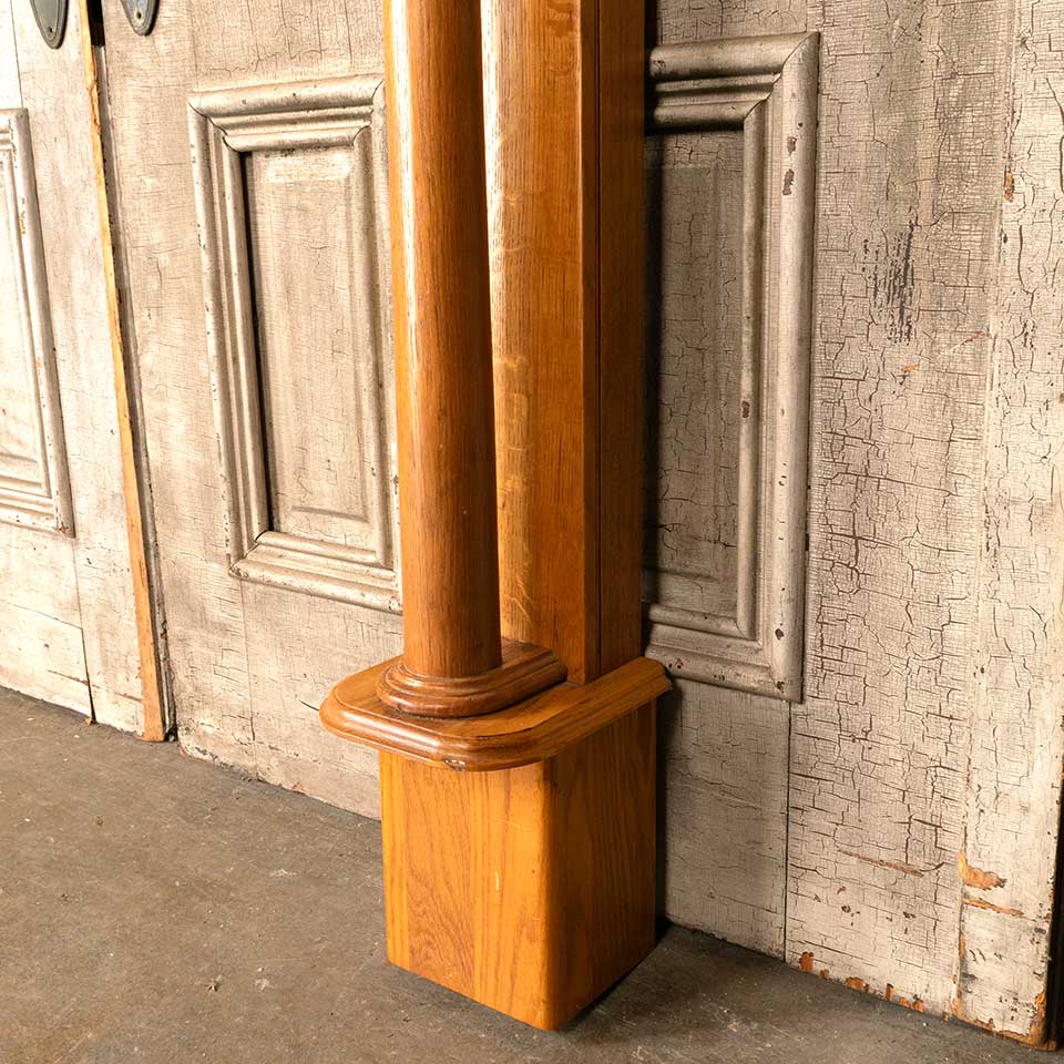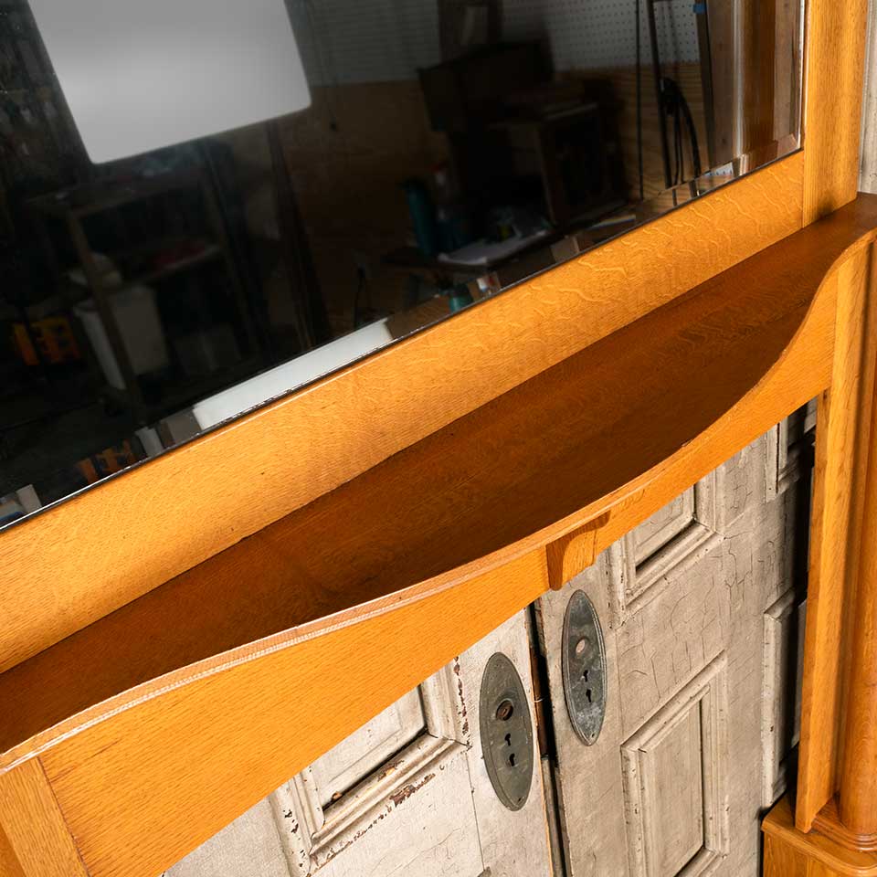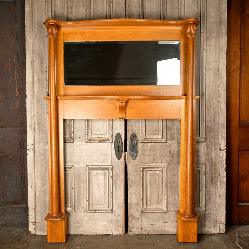 Architectural salvage oak fireplace mantel / mantle with beveled glass mirror and columns measuring approx. 54 5/8" wide x 77" tall x 9 1/2" front to back. The interior firebox opening measures approx. 41 1/2" wide x 43 3/4" tall. See photos to evaluate condition.