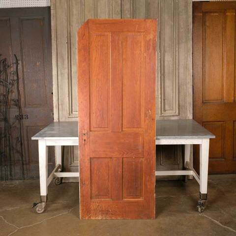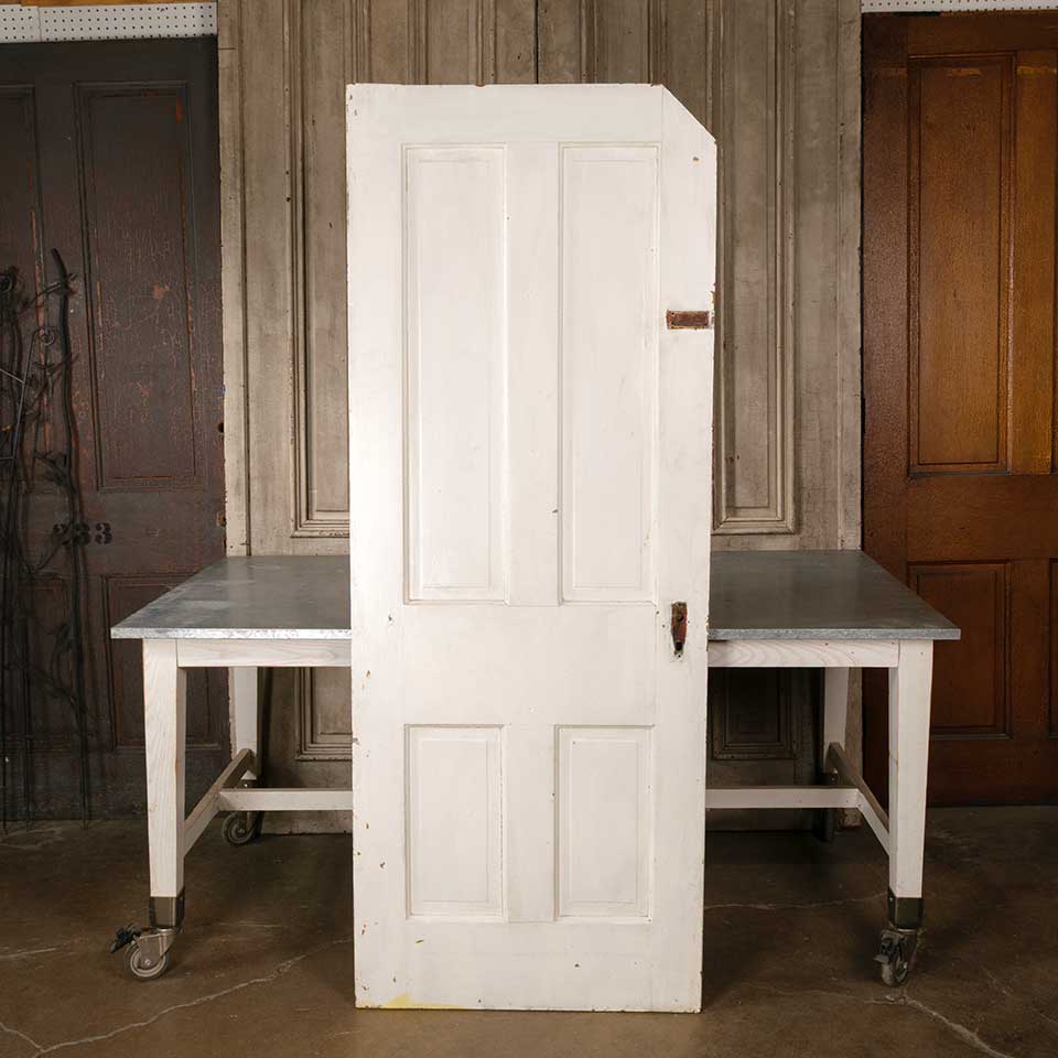 Architectural salvage antique four panel wood interior door with mortise lock measuring approx. 30" wide x 77 1/2" tall x 1 3/8" thick. One of the top corners is clipped. See photos to evaluate condition.
