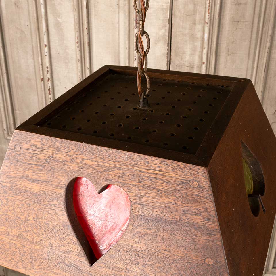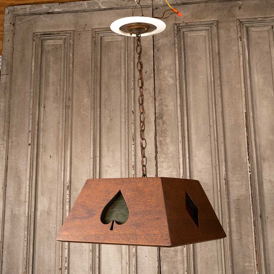 Architectural salvage vintage single bulb card game poker table pendant light fixture measuring approx. 16 1/8" x 16 1/8" x 29" tall. See photos to evaluate condition. Salvaged lighting should be inspected by a licensed electrician prior to installation.